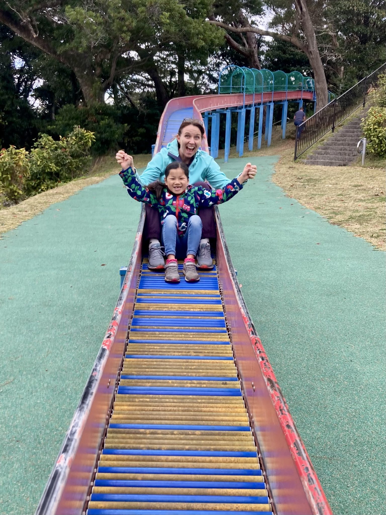 Feb 2023 – my daughter and me sliding down a roller side, which are common here in Japan.