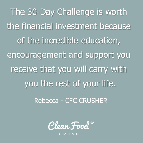 I’m so happy I started the 30-Day Challenge, and I believe you will be too. It’s worth the financial investment because of the incredible education, encouragement, and support you receive that you will carry with you the rest of your life. Stick to the program and you will see results; physically, mentally, and emotionally. The first few weeks were challenging for me, but it keeps getting easier and easier!