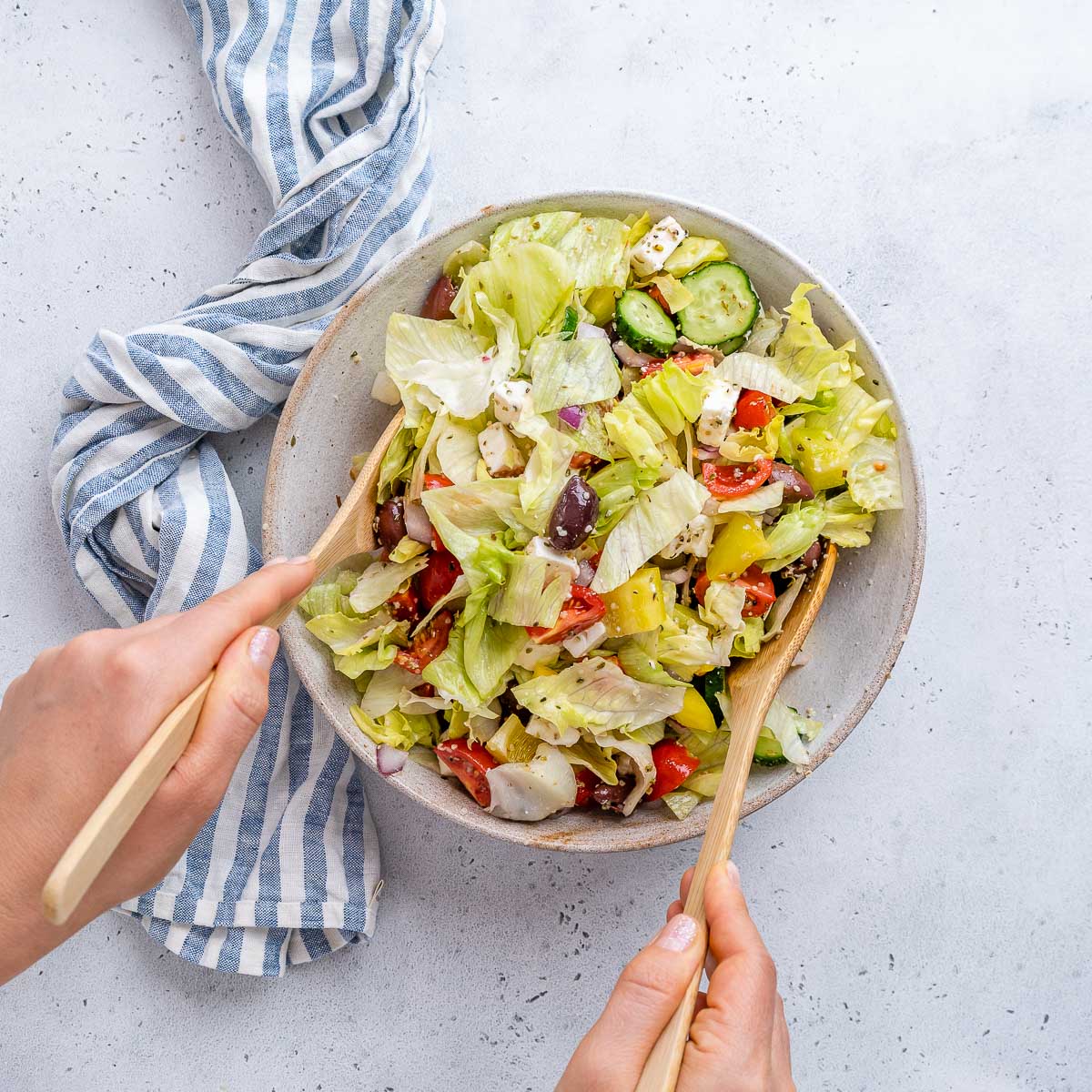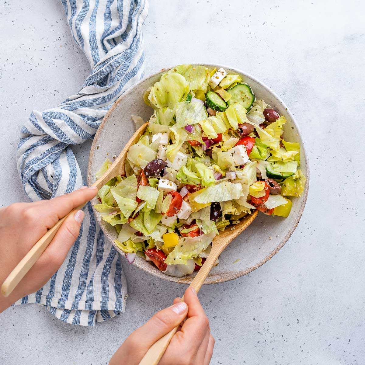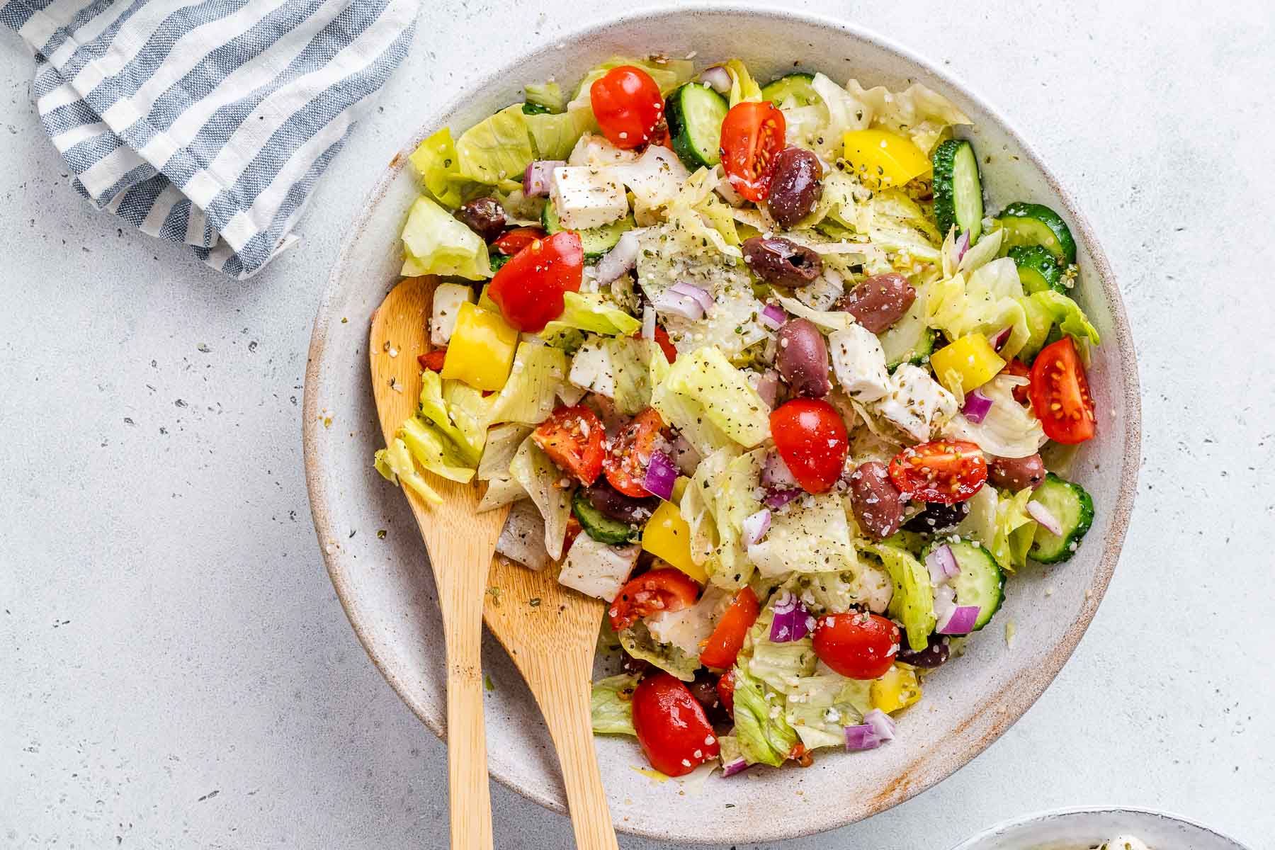 While not necessarily a traditional Greek salad, it is a delicious celebration of our favorite Greek flavors, with the crunch of iceberg lettuce as the perfect foundation.