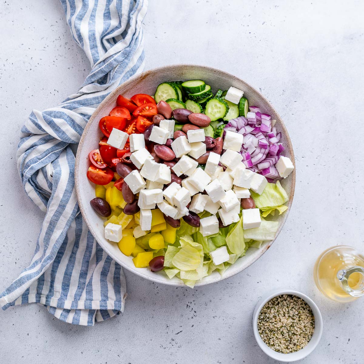- Add olives, feta cheese, everything bagel or hemp seeds, and oregano.
