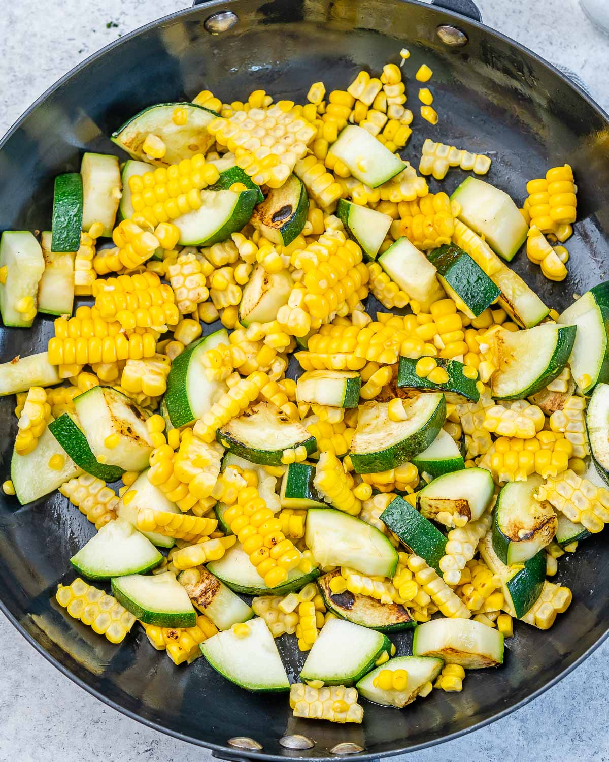 Heat your oil in a large skillet over medium heat. Saute the garlic for 30 seconds, then stir in the zucchini and fresh corn kernels.
