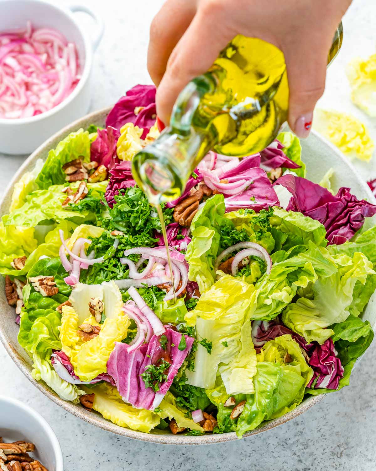- Add the walnuts or pecans and the marinated shallots together with all of the vinegar liquid.