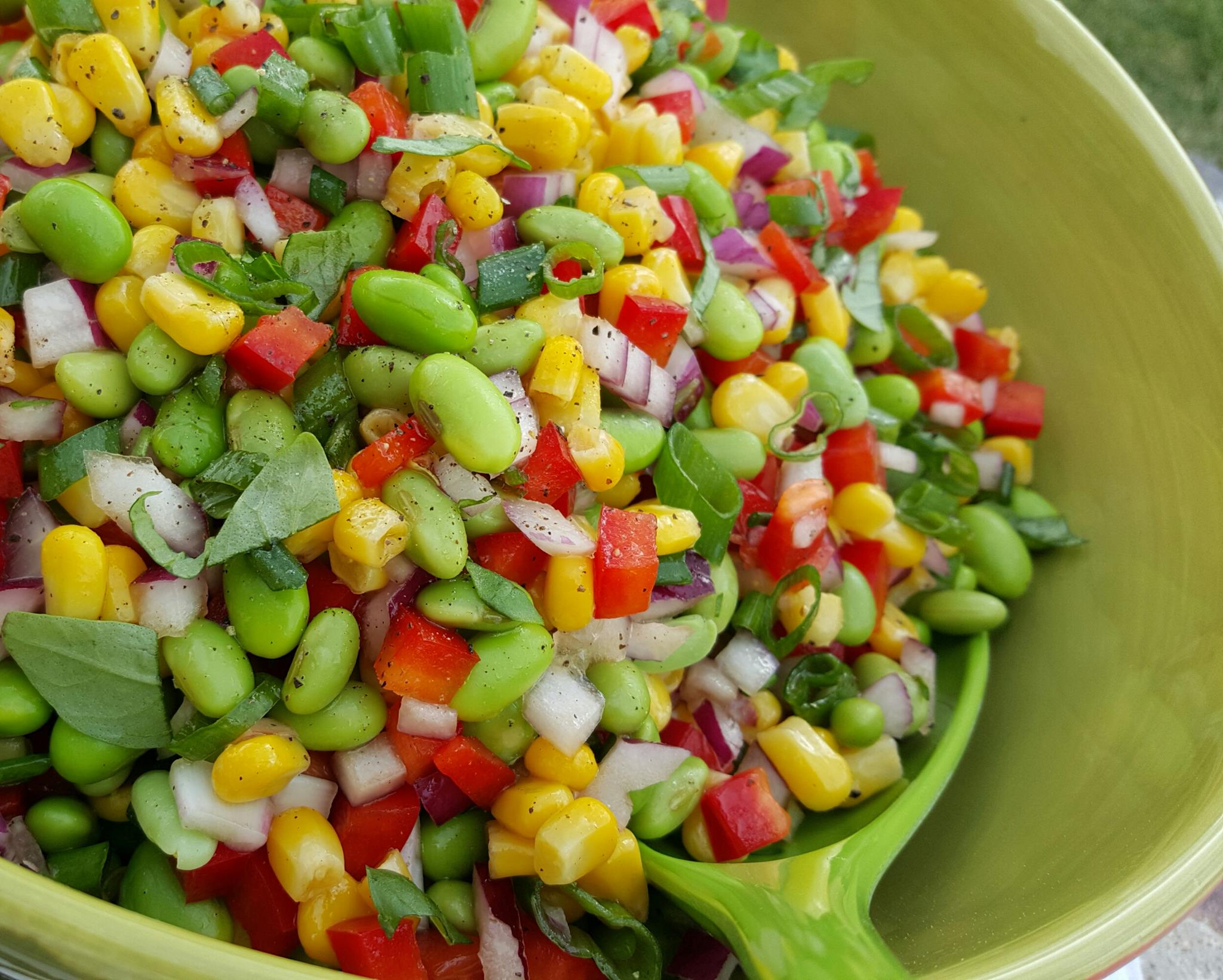 This super colorful salad is sure to satisfy any hungry guests! It’s light, full of yummy ingredients, and makes a LOT of servings – so you can enjoy it again and again! It’s made with edamame, corn, bell peppers, onions, parsley, and basil.