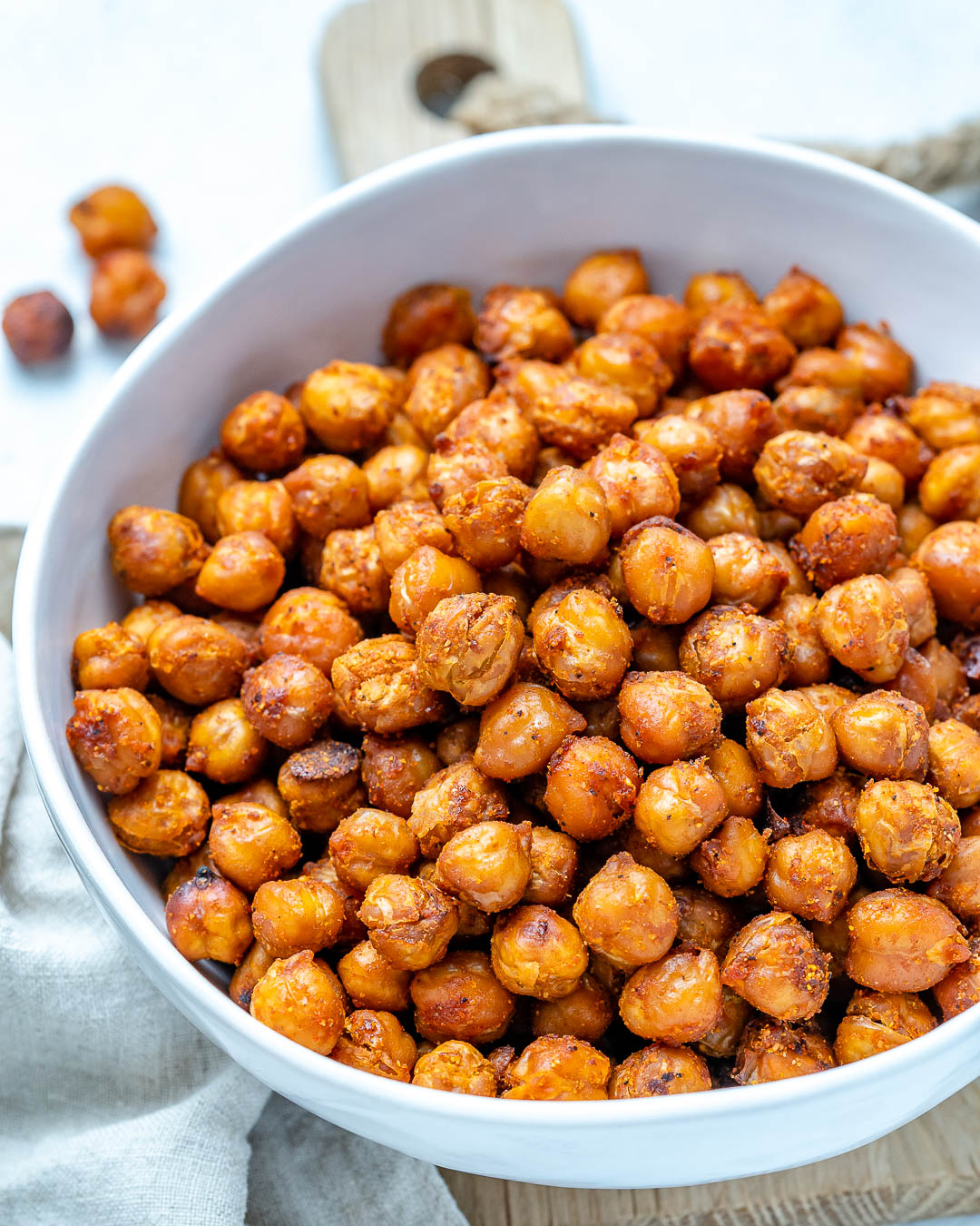 Garbanzo beans, or chickpeas, are full of protein and fiber and are loaded with vitamins and minerals. Chickpeas are especially high in a soluble fiber called raffinose that aids digestion and lowers cholesterol levels. They’re super nutritional and tasty, especially when roasted in this yummy BBQ sauce!