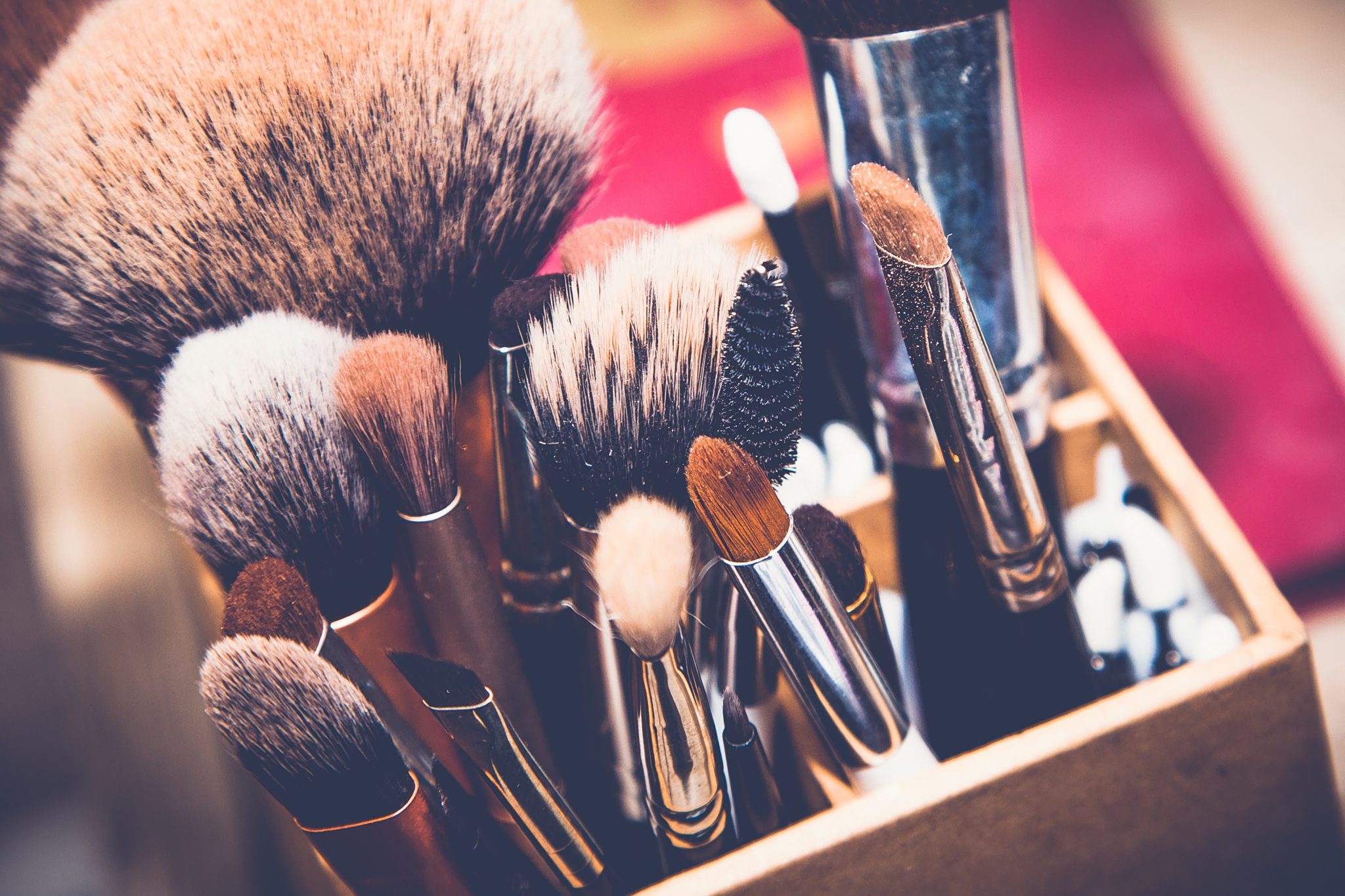 Here’s how: Put a drop of a mild shampoo into the palm of your hand. Wet the bristles with lukewarm water. Then, massage the bristles into your palm to distribute the shampoo into the brush. Avoid getting the metal part of the brush wet/or the brush hair base because the glue could soften, and the bristles could fall out. (We want to avoid this, so you’re not buying more brushes than you need to.) Rinse the shampoo out and squeeze out the water with a towel. Lay the brushes on their side with the bristles hanging off the edge of the counter to dry.