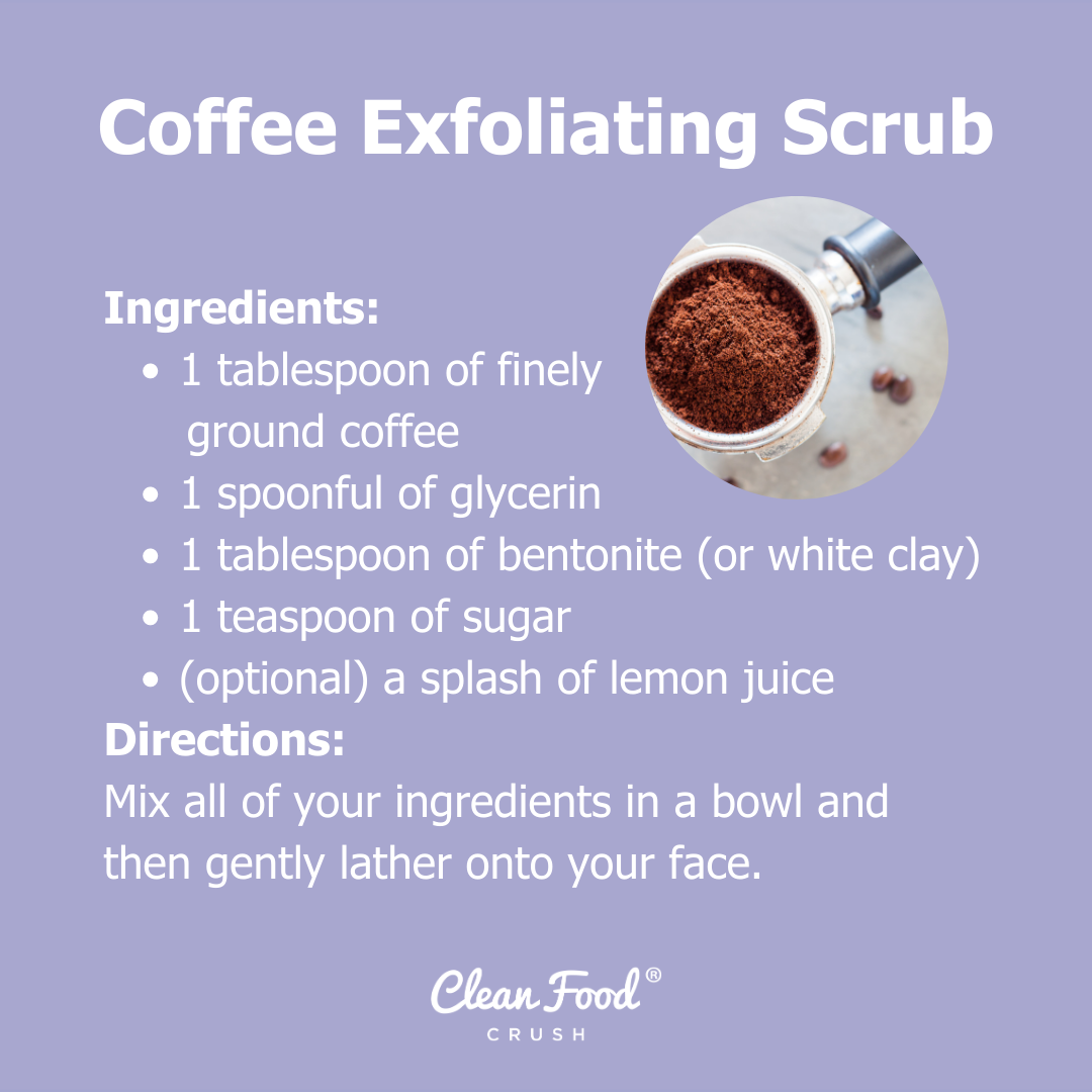 - Ingredients: 1 tablespoon of finely ground coffee, 1 spoonful of glycerin (or try shea butter, jojoba oil, cocoa butter, or avocado oil), 1 tablespoon of bentonite or white clay, 1 teaspoon of sugar, and you can add a splash of lemon juice if you’d like, but be careful if your skin is EXTRA sensitive!