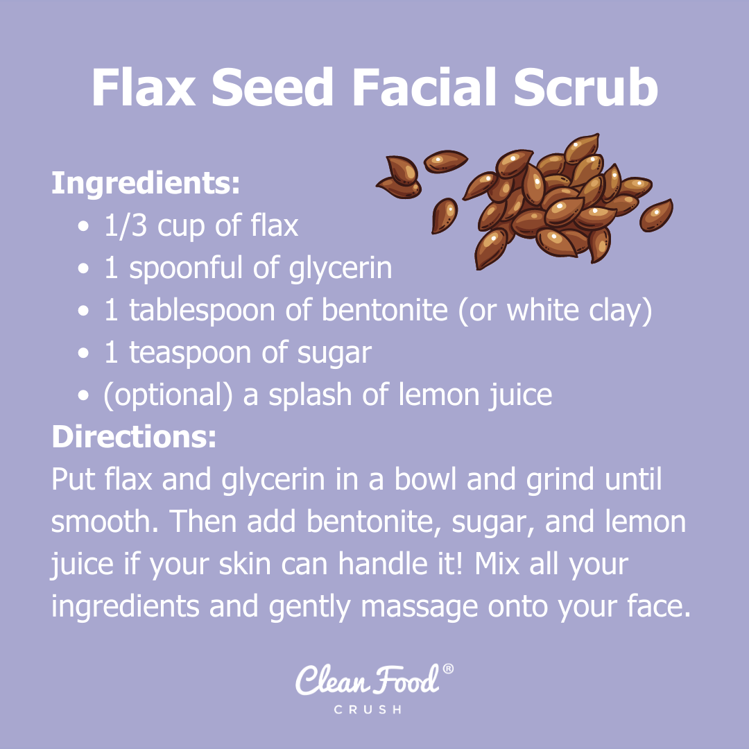 - Directions: Put about 1/3 cup of flax and a spoonful of glycerin (or try shea butter, jojoba oil, cocoa butter, or avocado oil) in a bowl and then grind until smooth. Then add 1 tablespoon of white clay, 1 teaspoon of sugar, and a splash of lemon juice if your skin can handle it! Mix all your ingredients and follow by gently swiping onto your face.