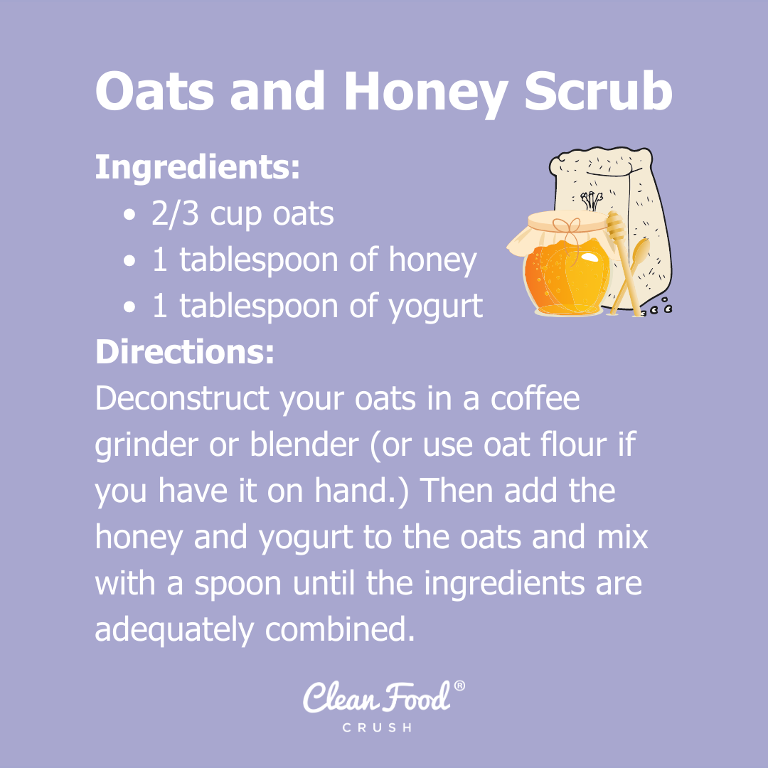 - Directions: You’ll need 2/3 cup oats, 1 tablespoon of honey, and 1 tablespoon of yogurt. Deconstruct your oats in a coffee grinder or blender (or use oat flour if you have it on hand.) Then add the honey and yogurt to the oats and mix with a spoon until the ingredients are adequately combined. Then, yep, you know the drill. Start slathering that scrub onto your face.