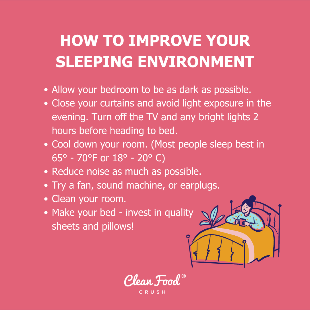 After you’ve completed your bedtime routine, what environment are you entering? Your sleep environment sends a powerful message to your mind and body, so be sure it’s perfect. While this may be slightly different for everyone, in general, where you sleep should be a dark, cool, quiet, clean, relaxing, and comfortable environment.