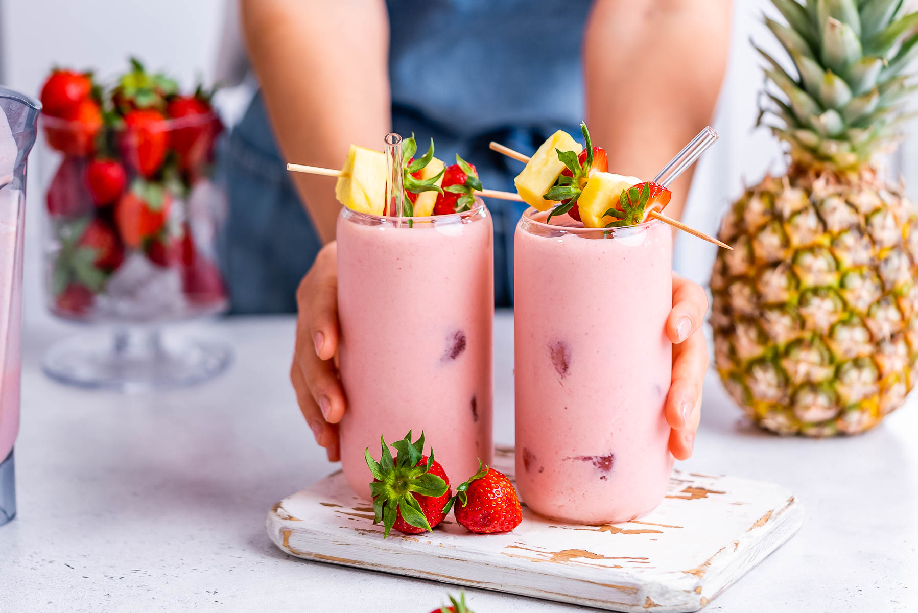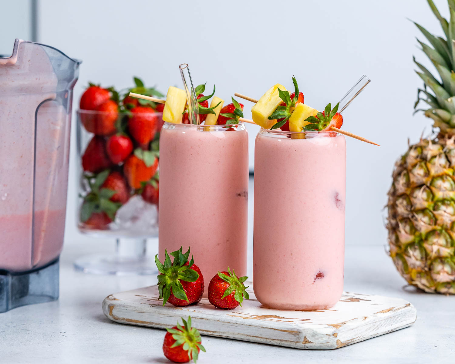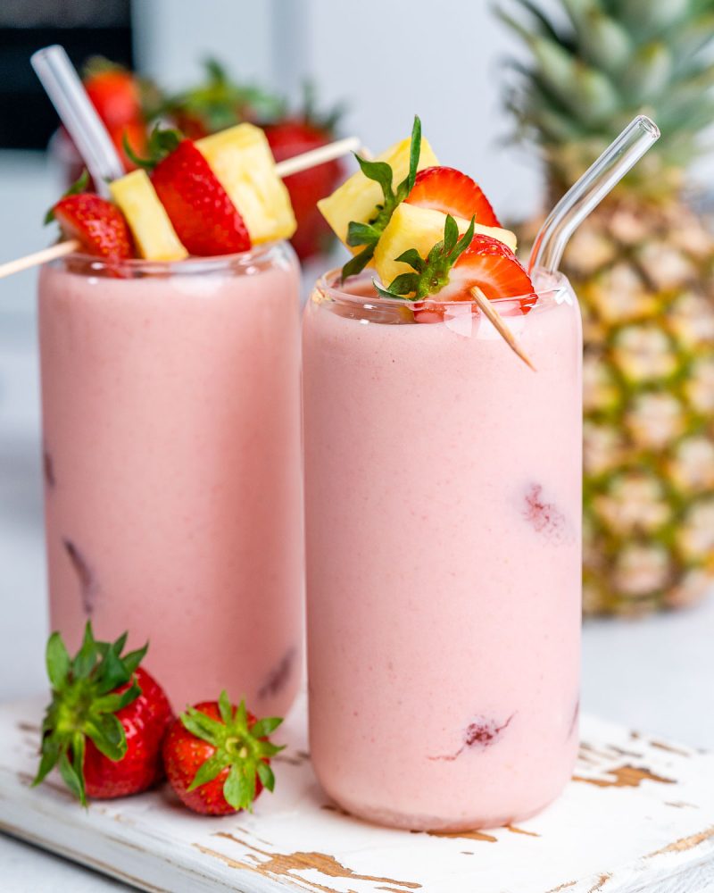 - Place coconut milk, strawberries, and pineapple in a blender and blend until smooth. If you're using fresh fruit instead of frozen fruit, you'll want to add a few ice cubes. If you're using frozen fruit, you don't need ice cubes.