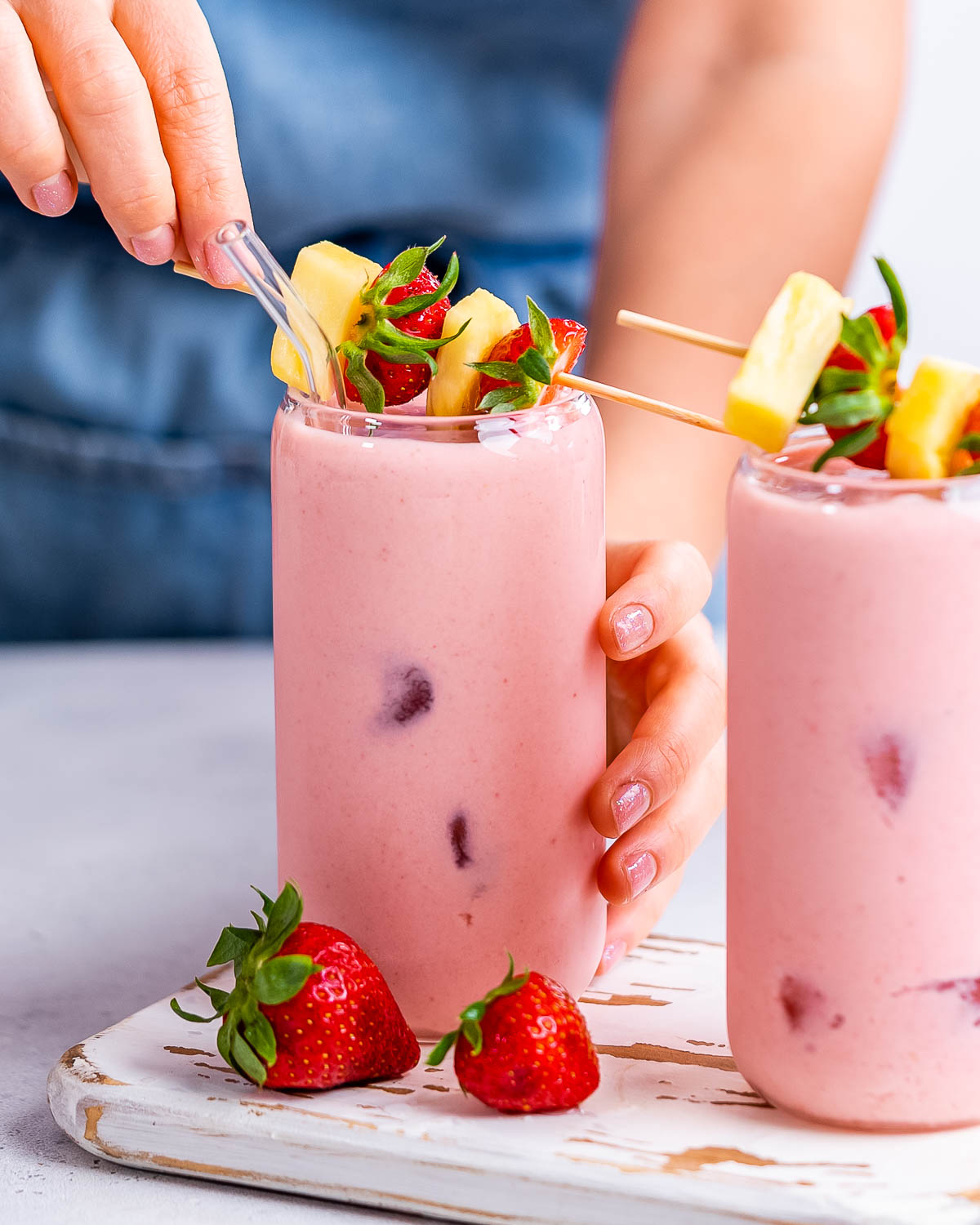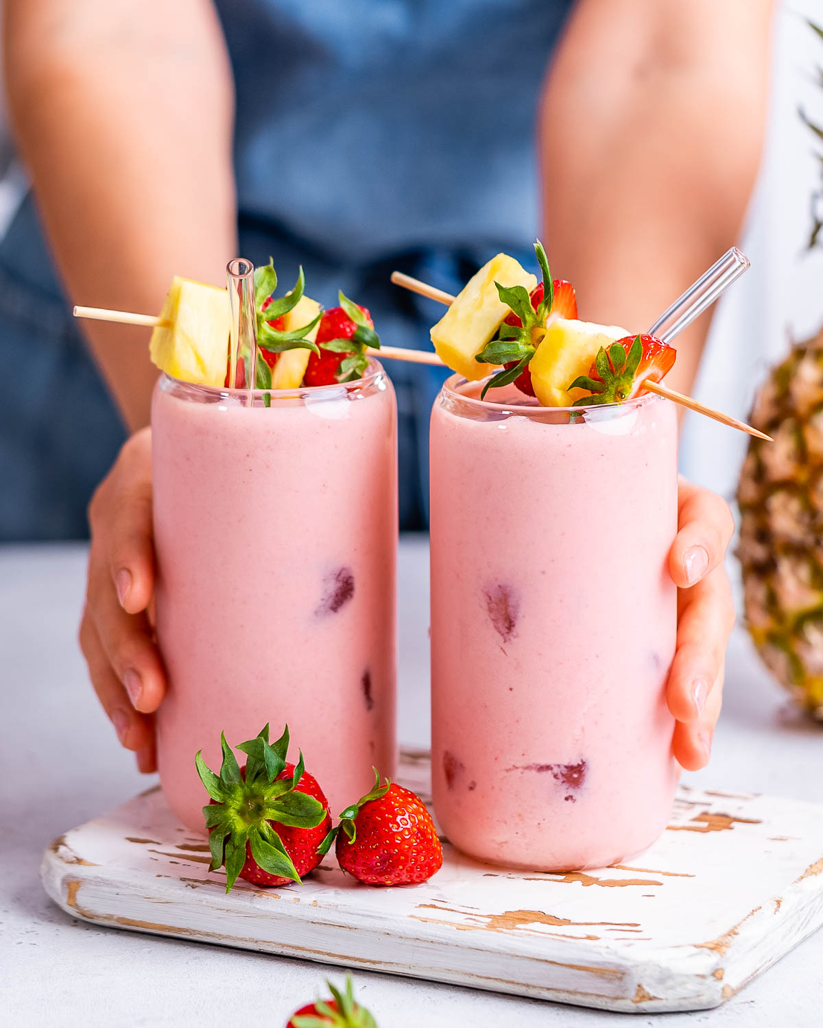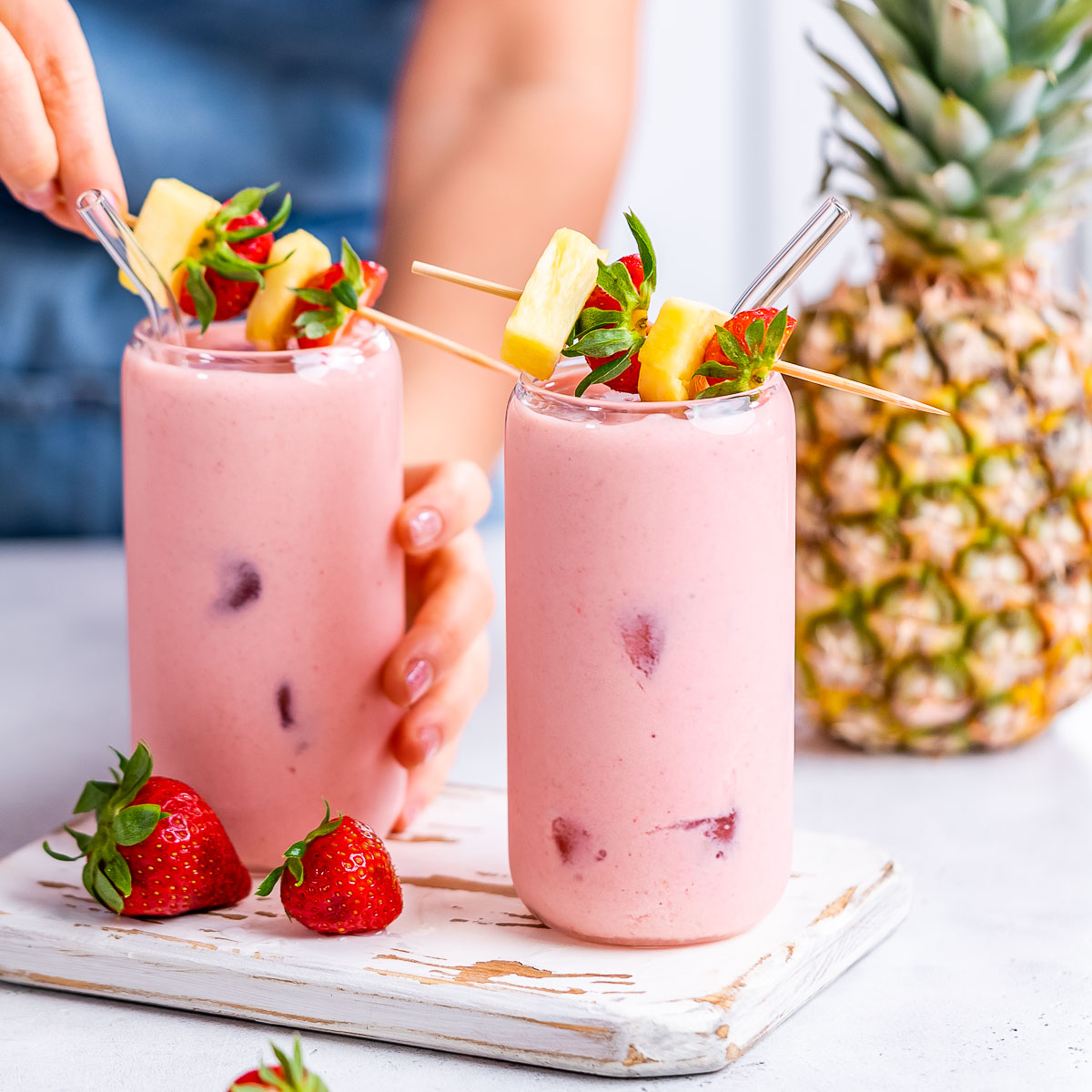 - Place coconut milk, strawberries, and pineapple in a blender and blend until smooth. If you're using fresh fruit instead of frozen fruit, you'll want to add a few ice cubes. If you're using frozen fruit, you don't need ice cubes.
