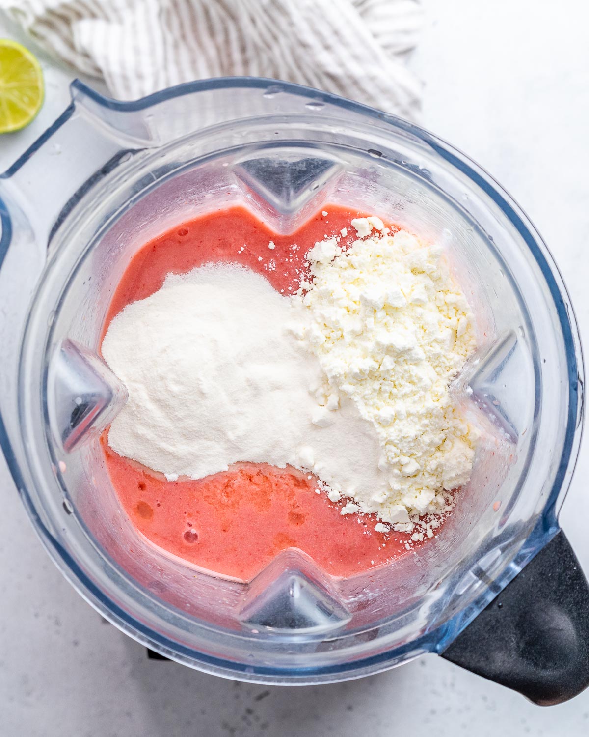 - Add in your fresh lime juice, protein powder, and the collagen. Blend until well incorporated.