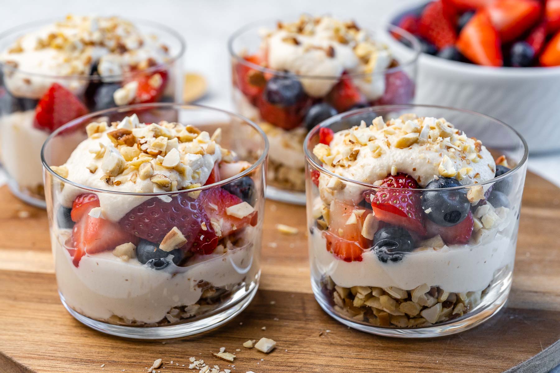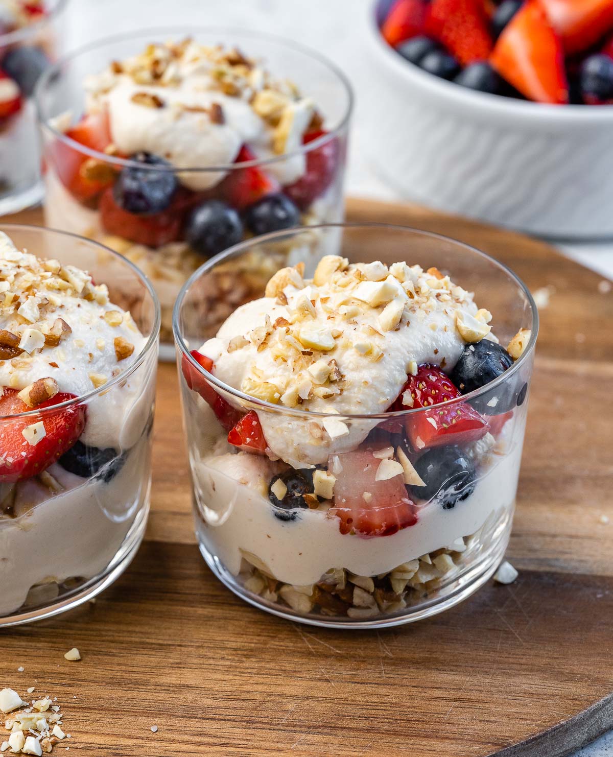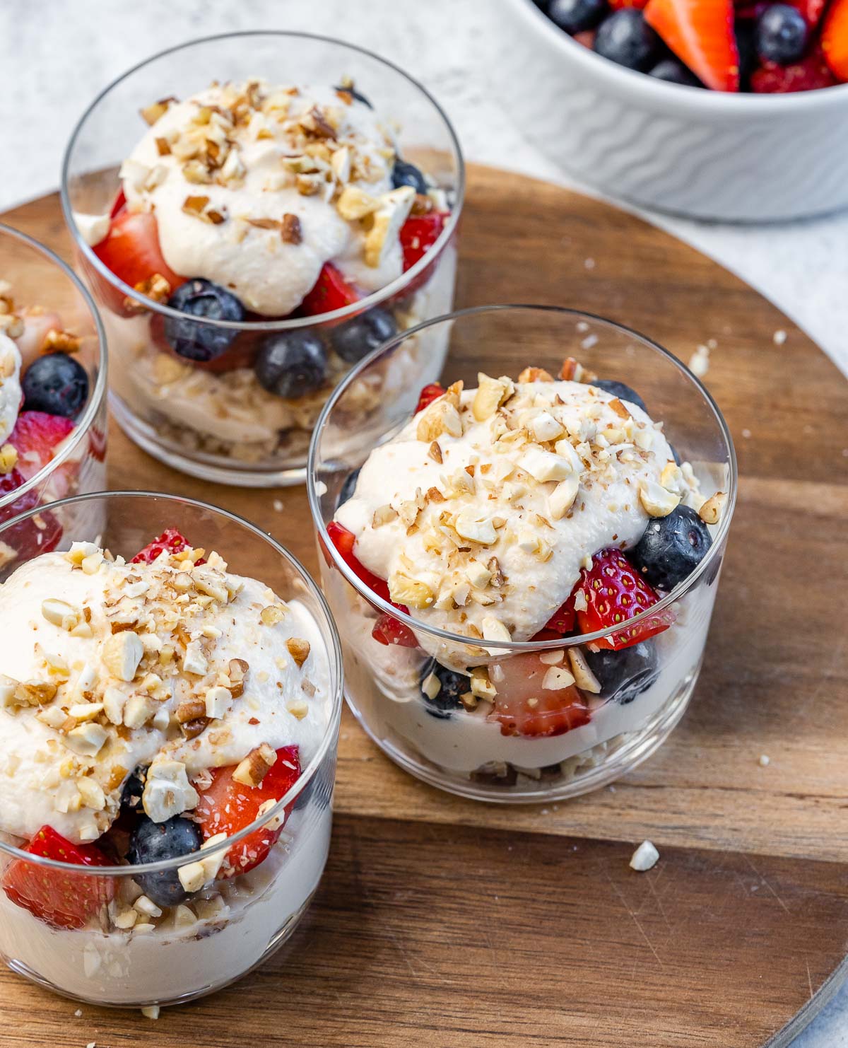 Top with fresh berries. Repeat layers as desired. Depending on the size of the serving cups you’re using, you may want 2 or 3 layers.