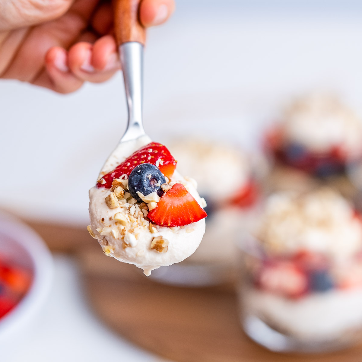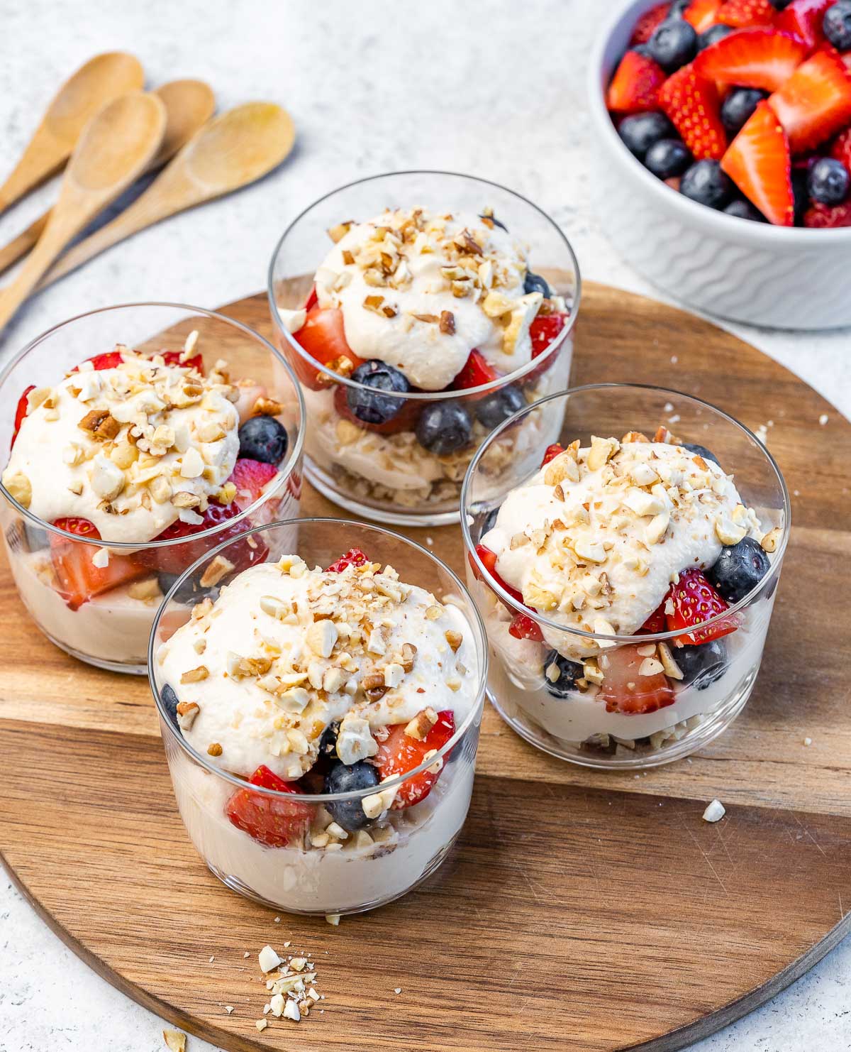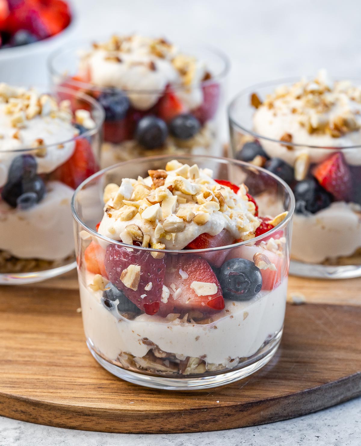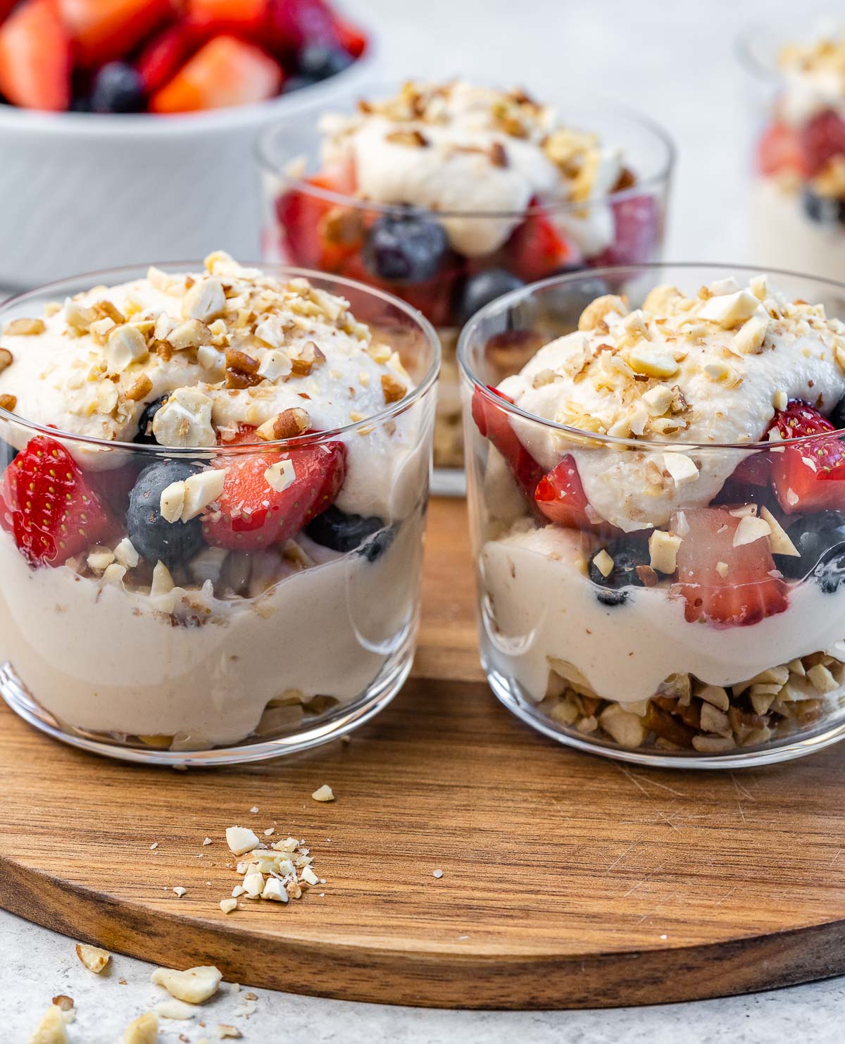 Top with fresh berries. Repeat layers as desired. Depending on the size of the serving cups you’re using, you may want 2 or 3 layers.