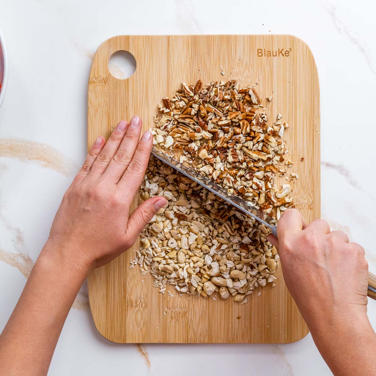 - Place your pecans and cashews on a clean cutting board and coarsely chop.
