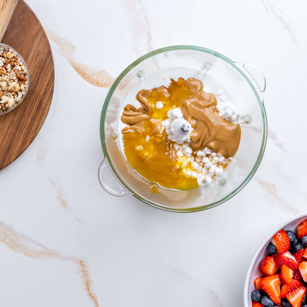 - In a food processor, add the cottage cheese, nut butter, honey, and vanilla.