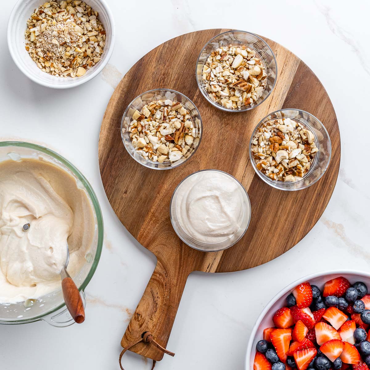 - Transfer and divide chopped nuts equally among 4 serving cups, reserving about 1/4 of your chopped nuts to sprinkle on top layer.