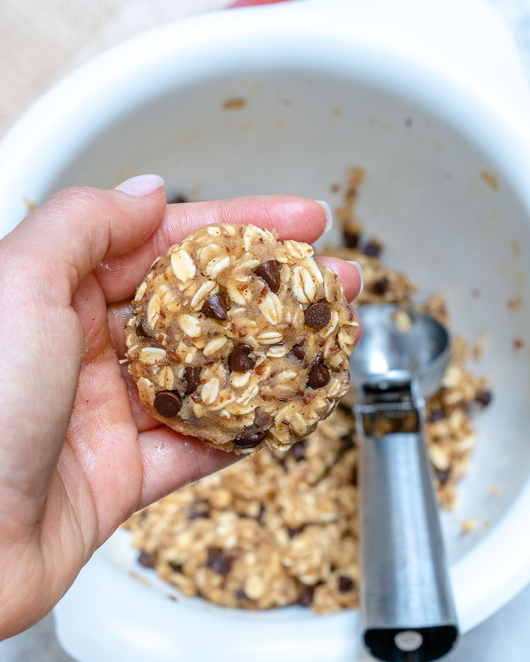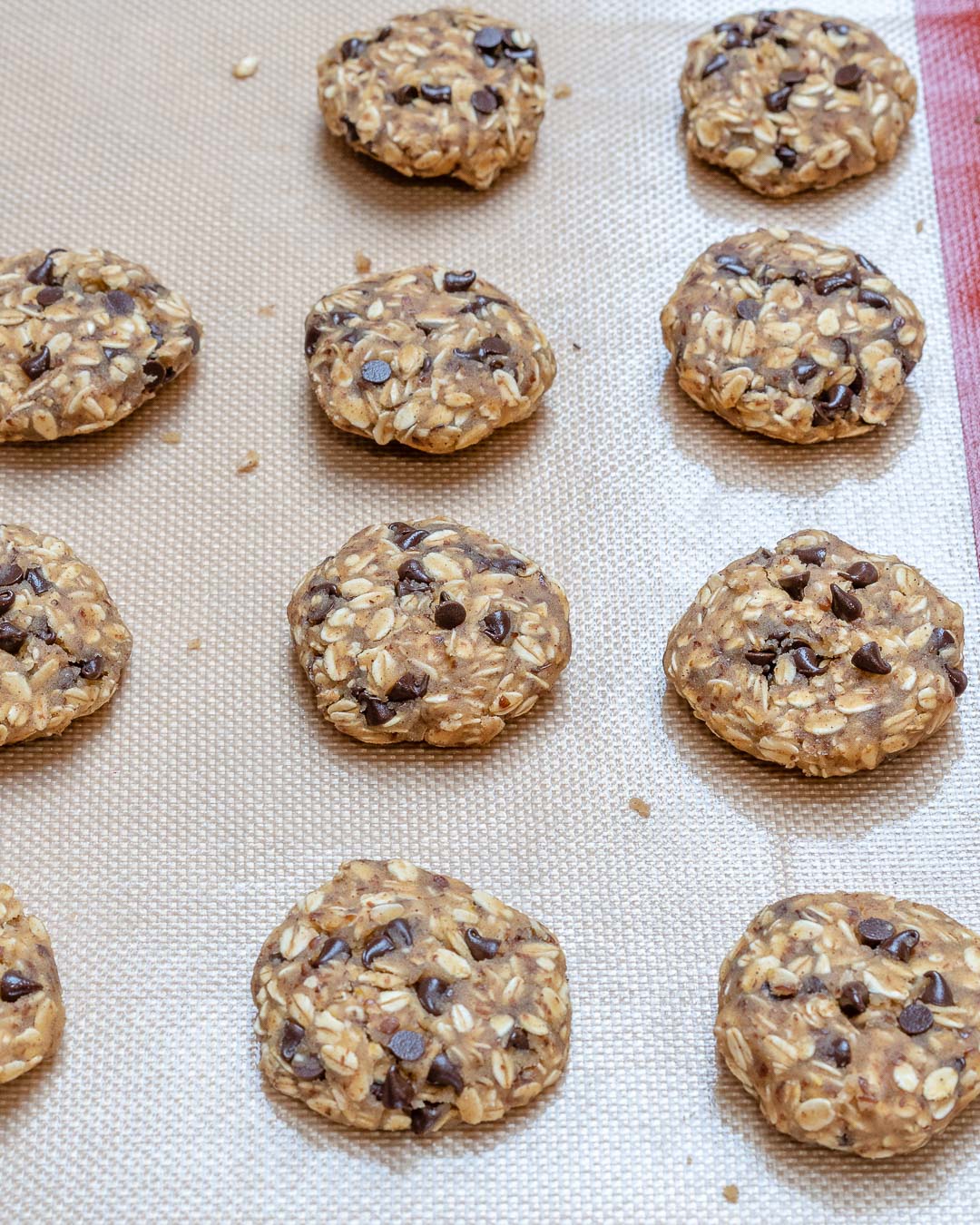 - Using clean hands, form dough into 12 large cookies as shown then place on a baking sheet.