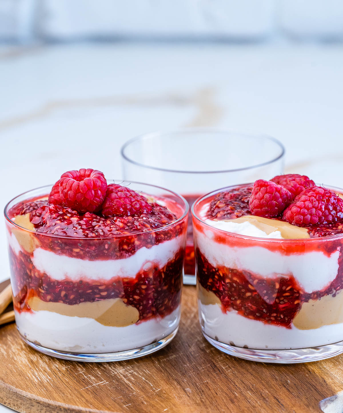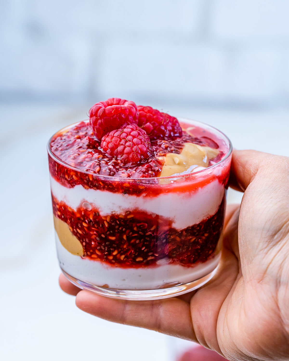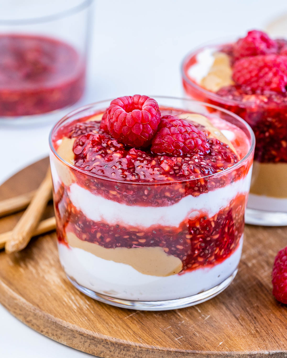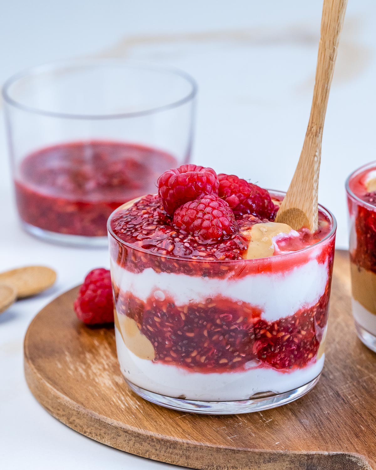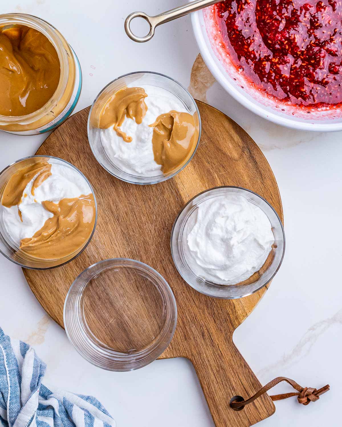 - To assemble your cups, add a layer of cheesecake mix followed by a layer of mashed raspberries and a small drizzle of nut butter as shown.