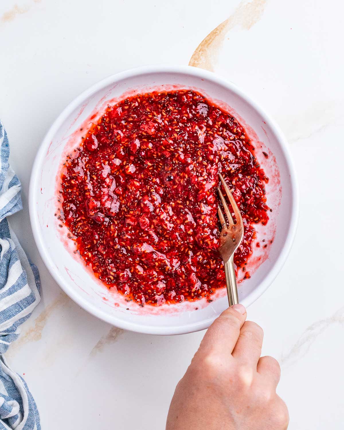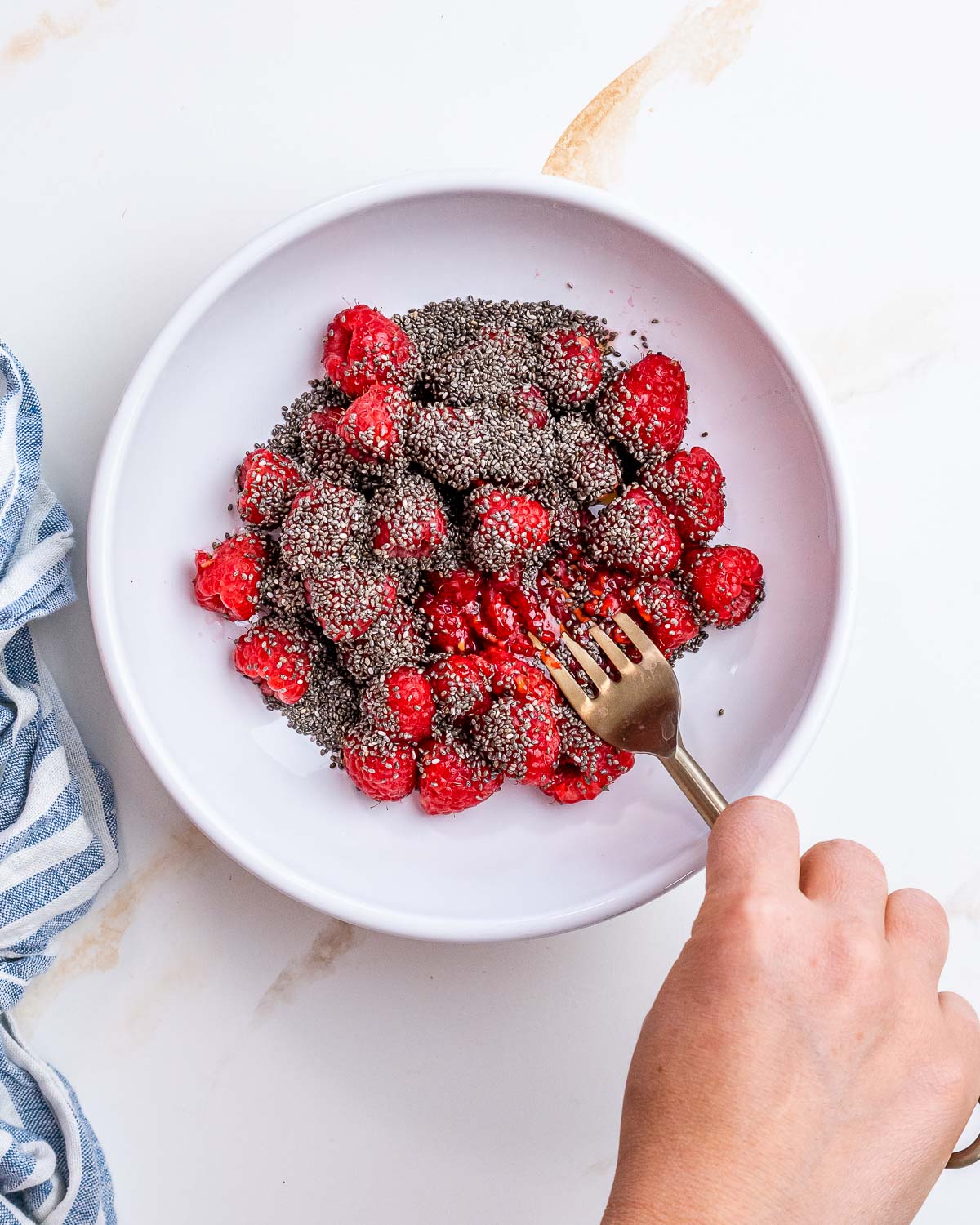 - Place your fresh raspberries in a shallow bowl or large plate then add the chia seeds.