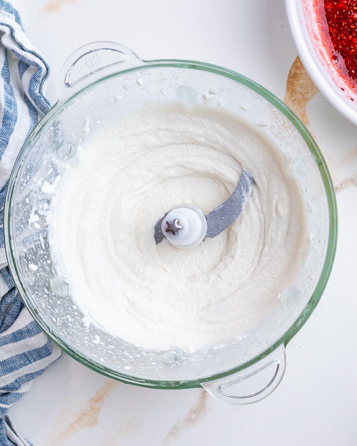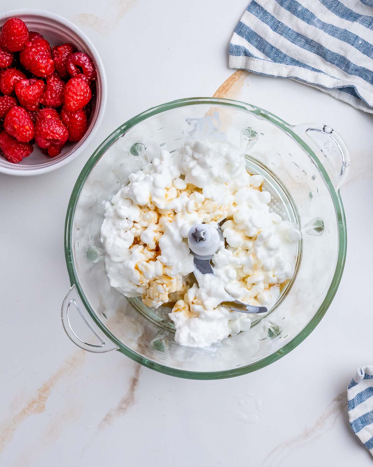 - In a food processor or blender add your cottage cheese, honey, vanilla, protein powder, and collagen. Blend until smooth.