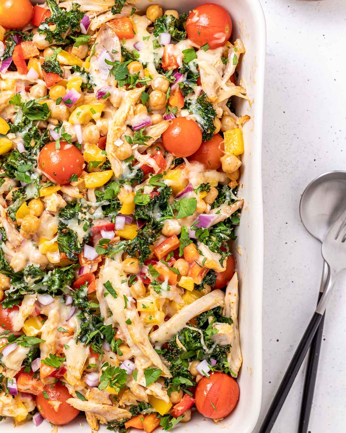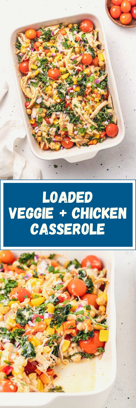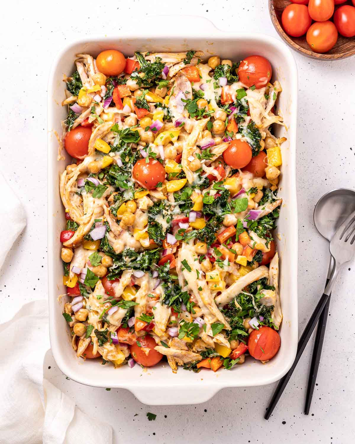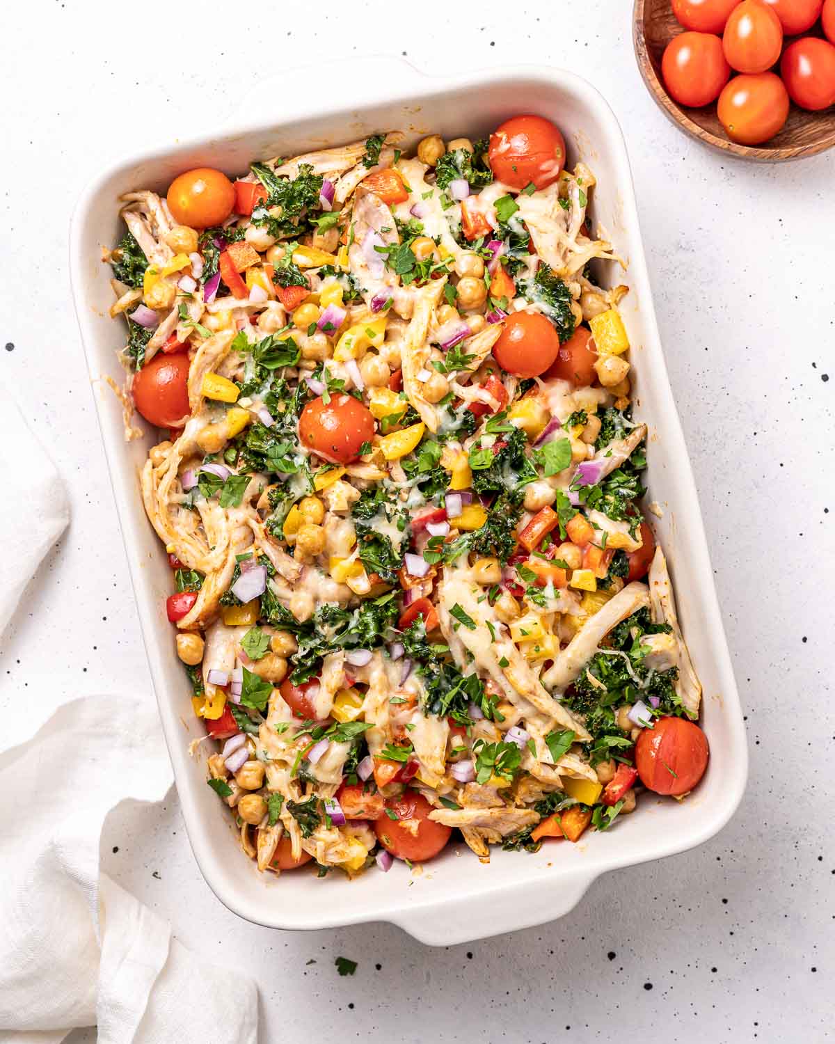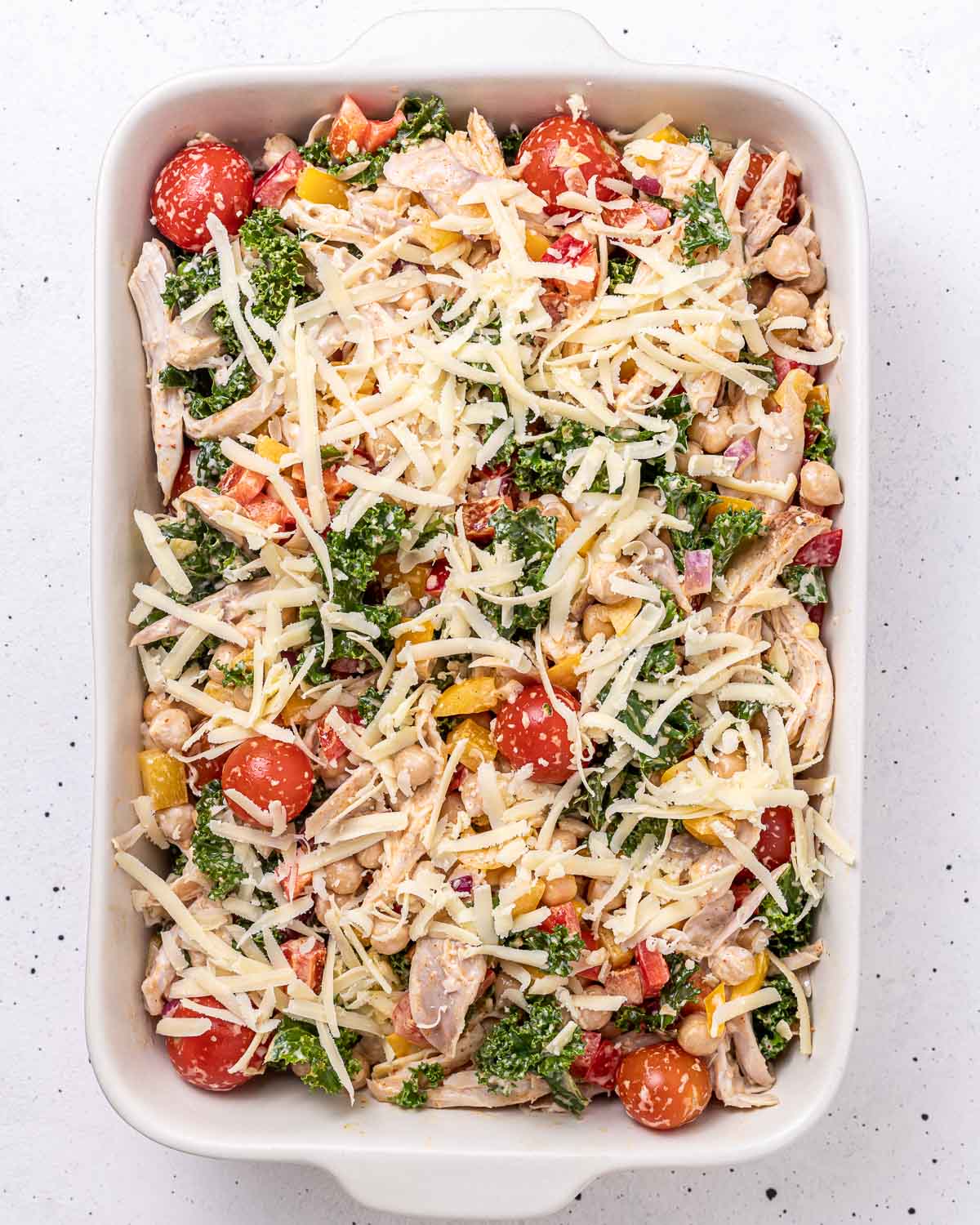 Transfer half of your veggie-chicken mixture to a large baking dish and sprinkle with half of the cheese. Repeat with the remaining half of the ingredients topping with cheese.