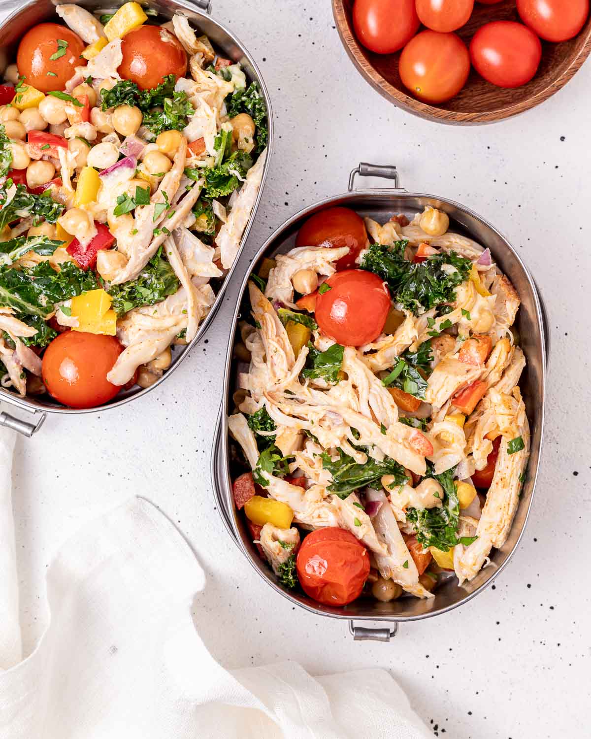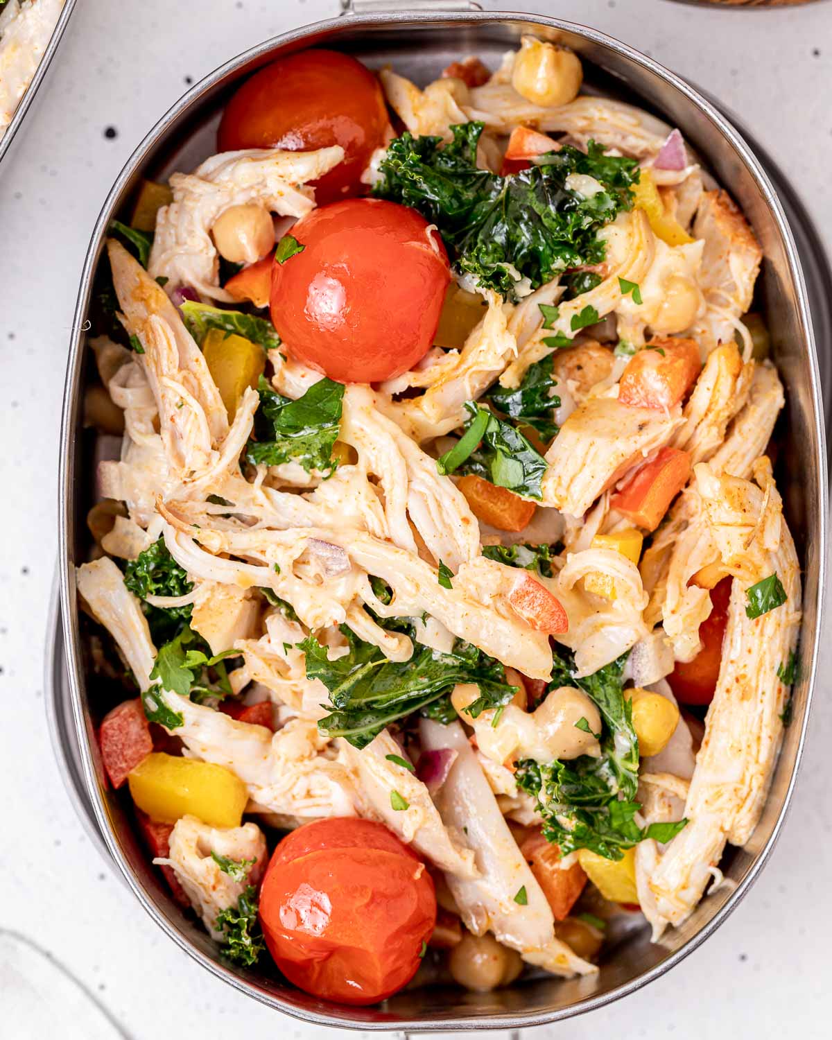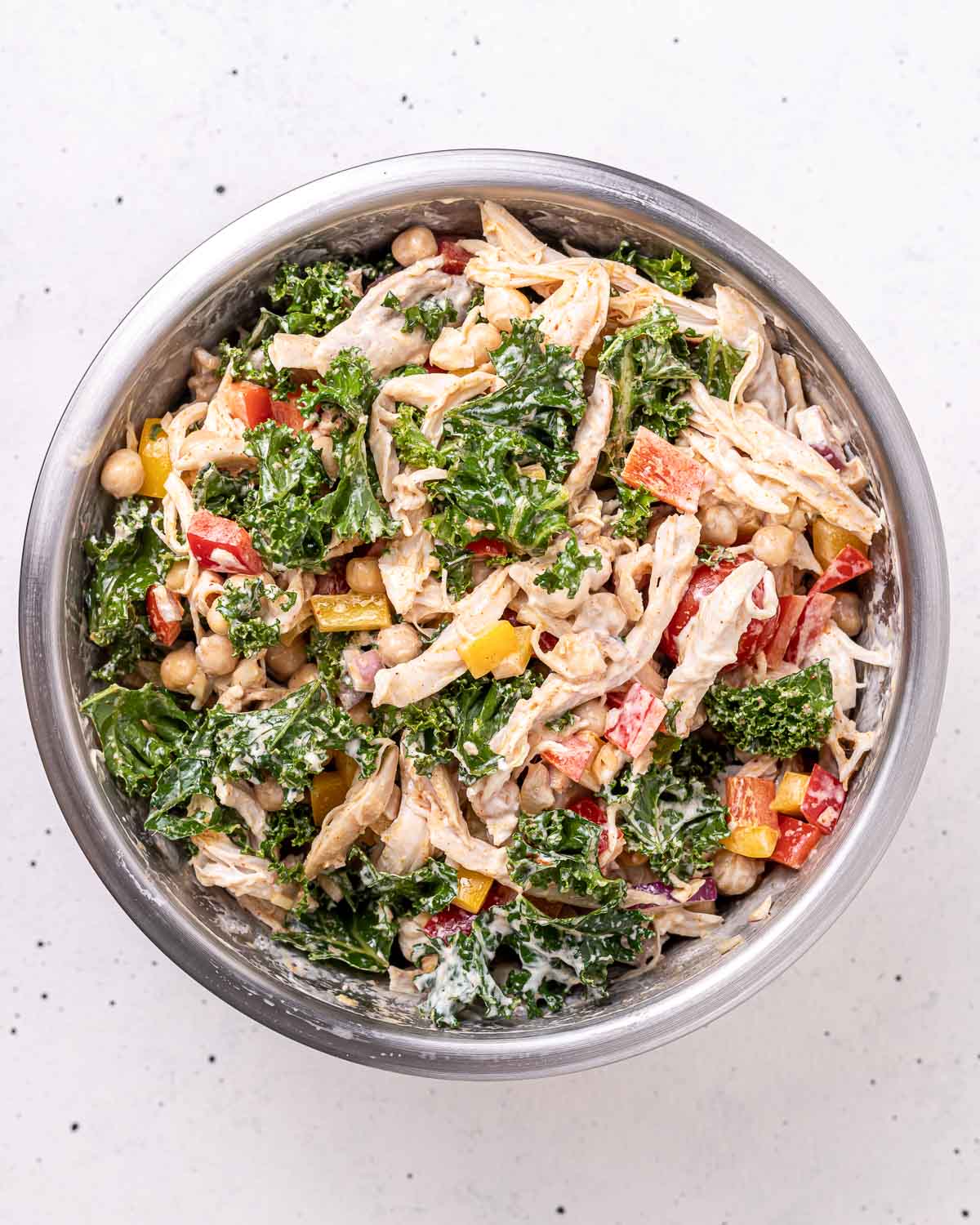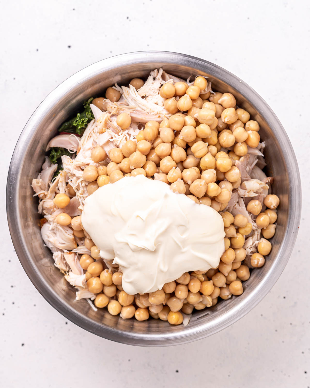 Add in the chickpeas, chicken, and mayonnaise or Greek yogurt, sea salt and freshly ground black pepper to taste then toss well to combine.