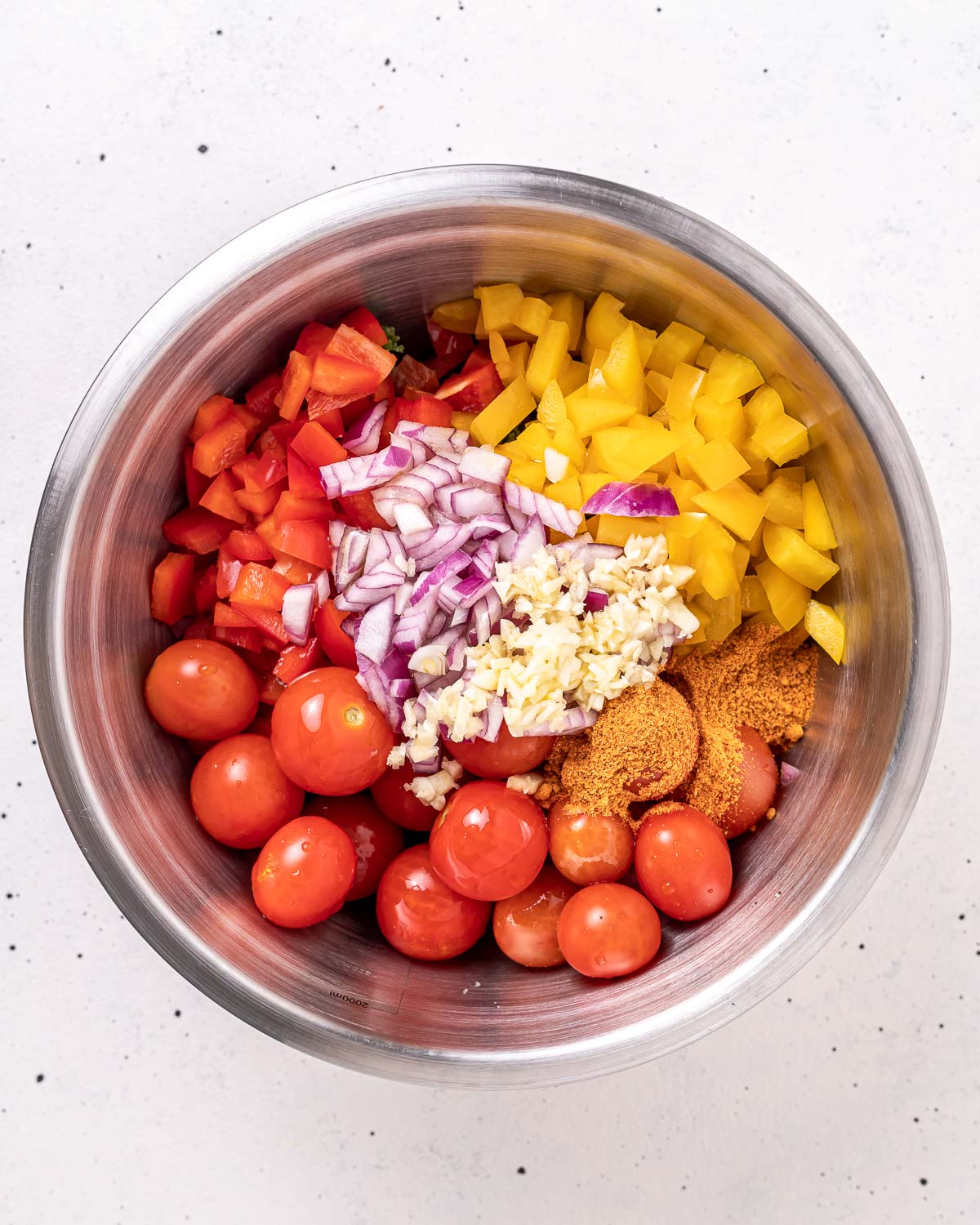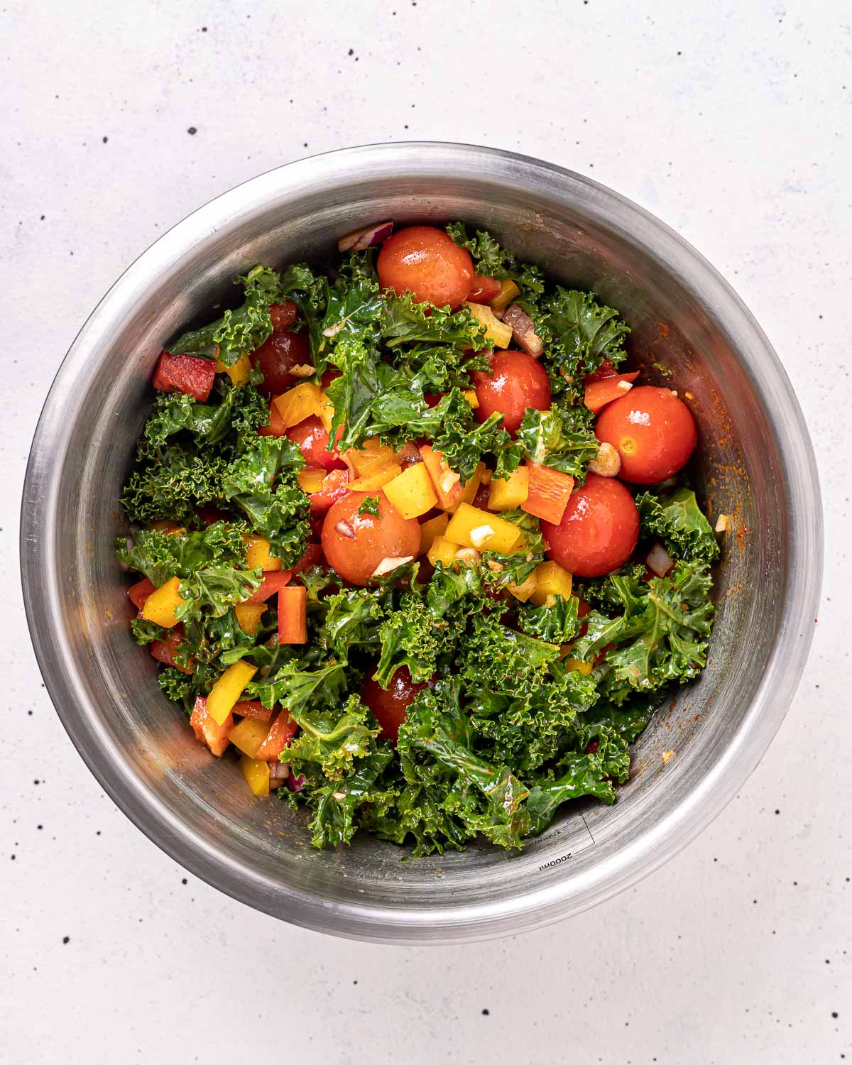 - Place the peppers, onion, garlic, tomatoes, kale, and taco seasoning in a large bowl. Drizzle with your oil and thoroughly toss then rub with your hands to evenly season the veggies paying special attention to the kale.