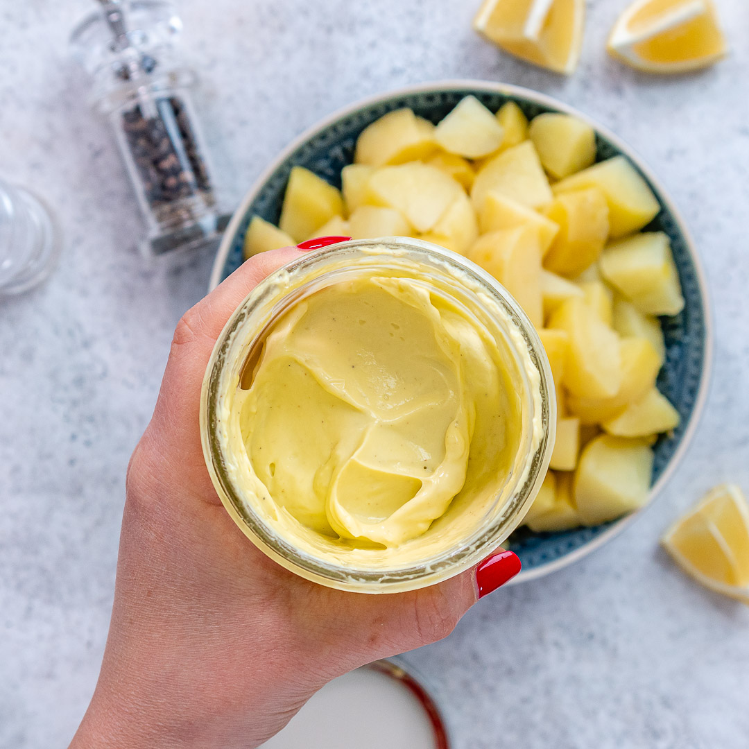 Once your mayonnaise starts to form at the bottom of the jar, you can start gently moving the blender slightly up and down, to make sure everything is evenly incorporated.