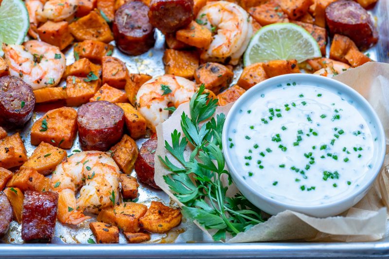 Sheet Pan Shrimp ‘Boil’ + Homemade Ranch Sauce