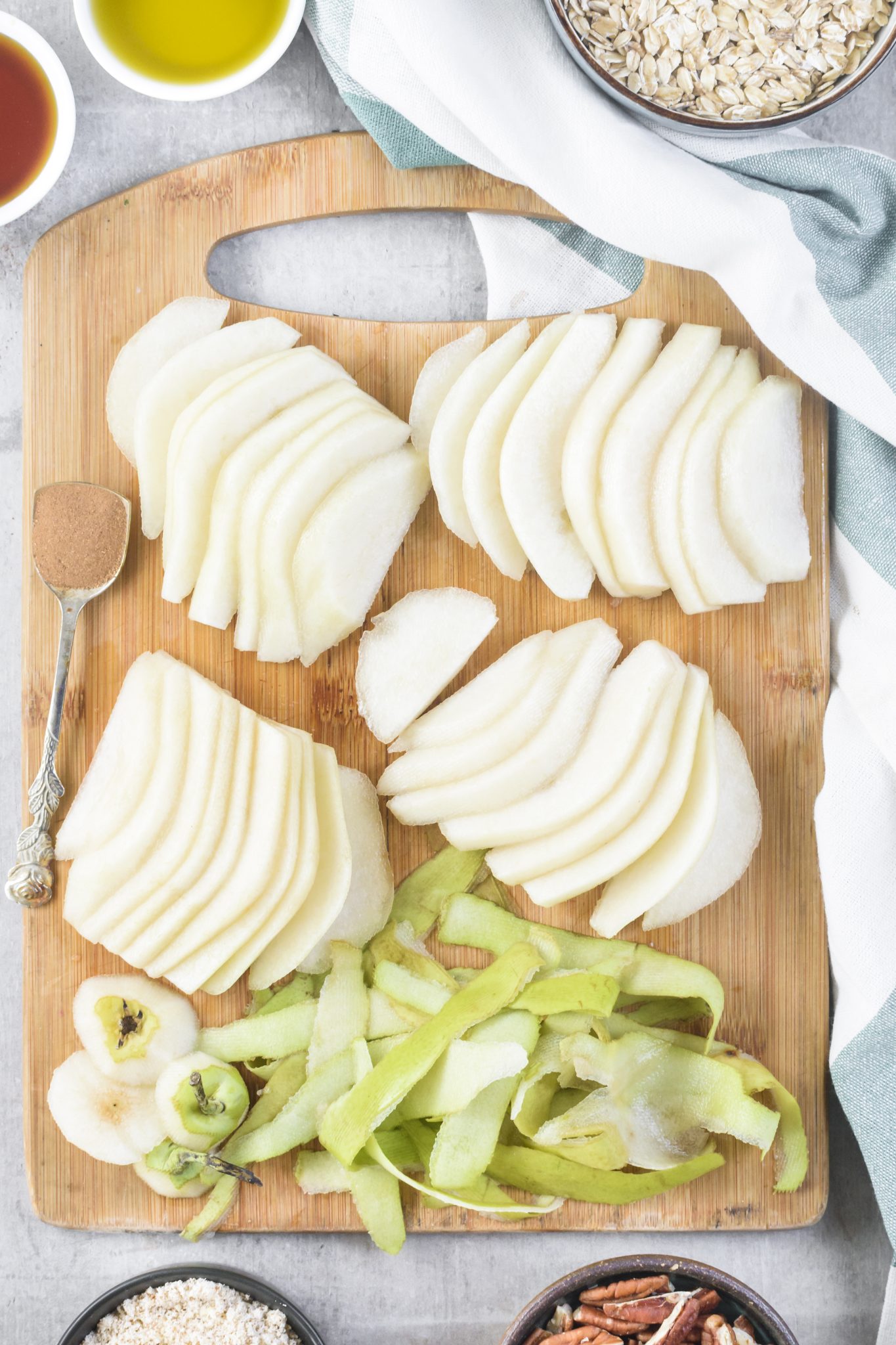 - Rinse and peel your pears. Remove the stems. Slice the pears (avoiding the core) into pieces about ā -inch thick.