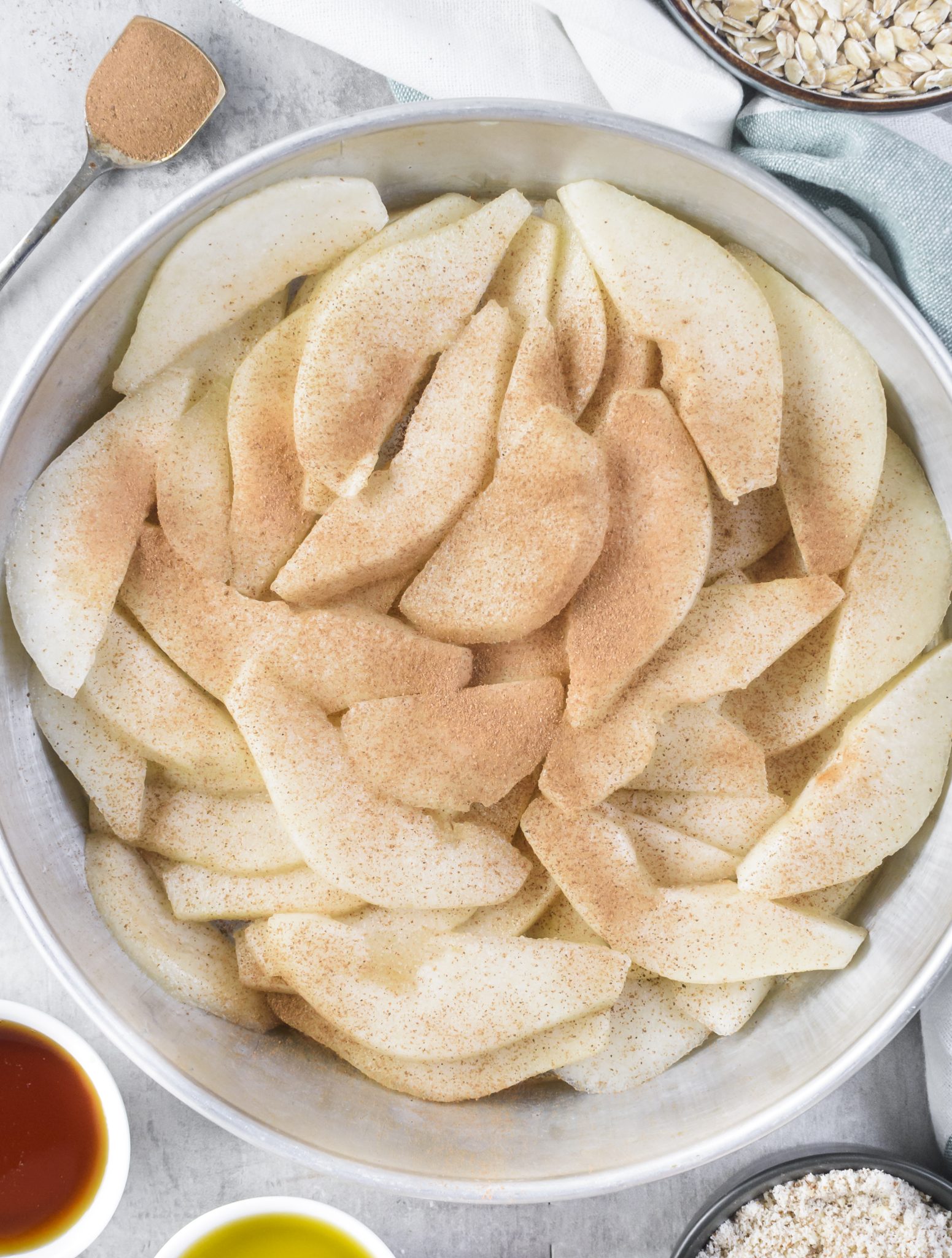 - Place your pears in an ungreased pie dish and toss them with cinnamon.