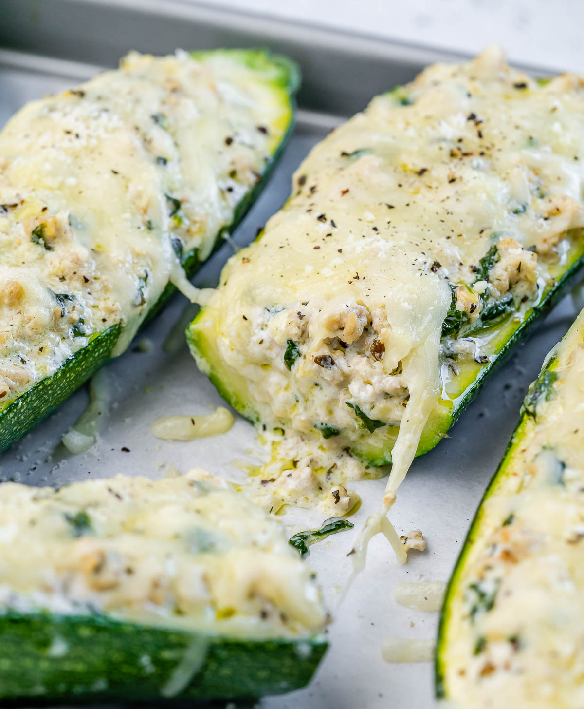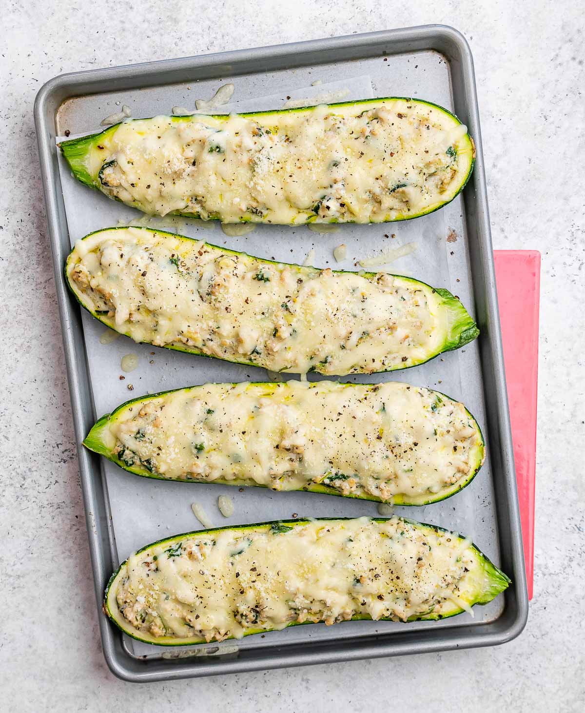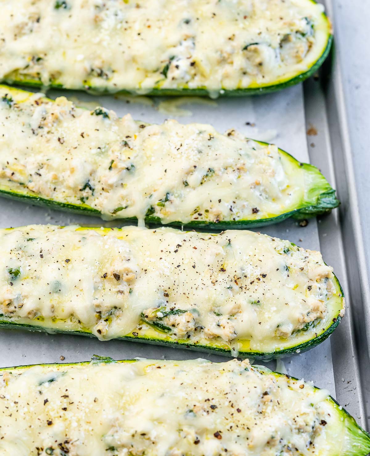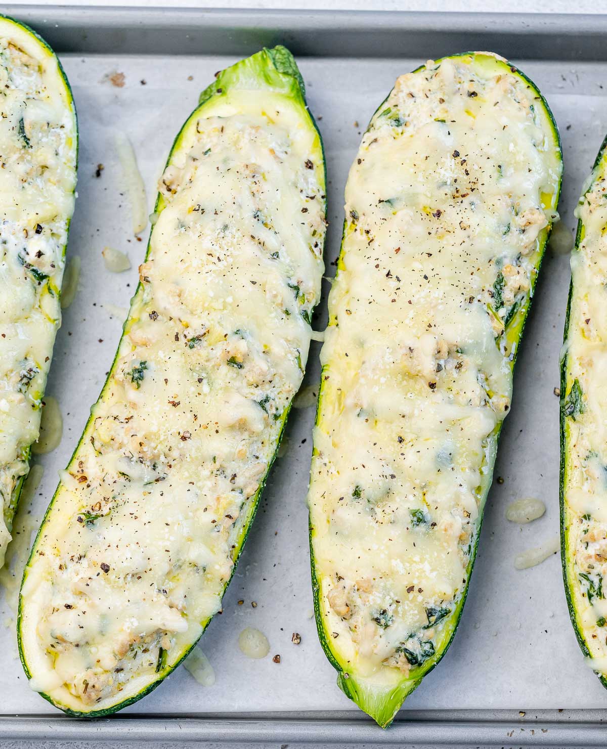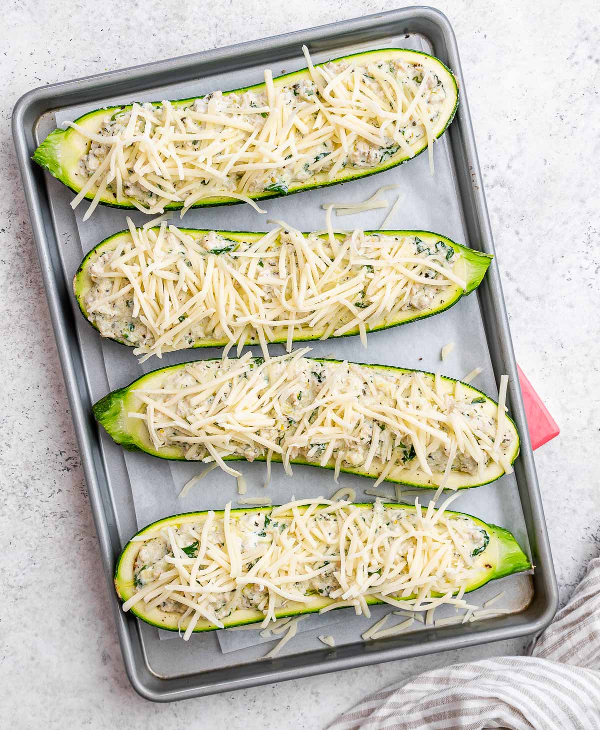 - Stuff the zucchini boats evenly with your mixture, then sprinkle with the cheese.