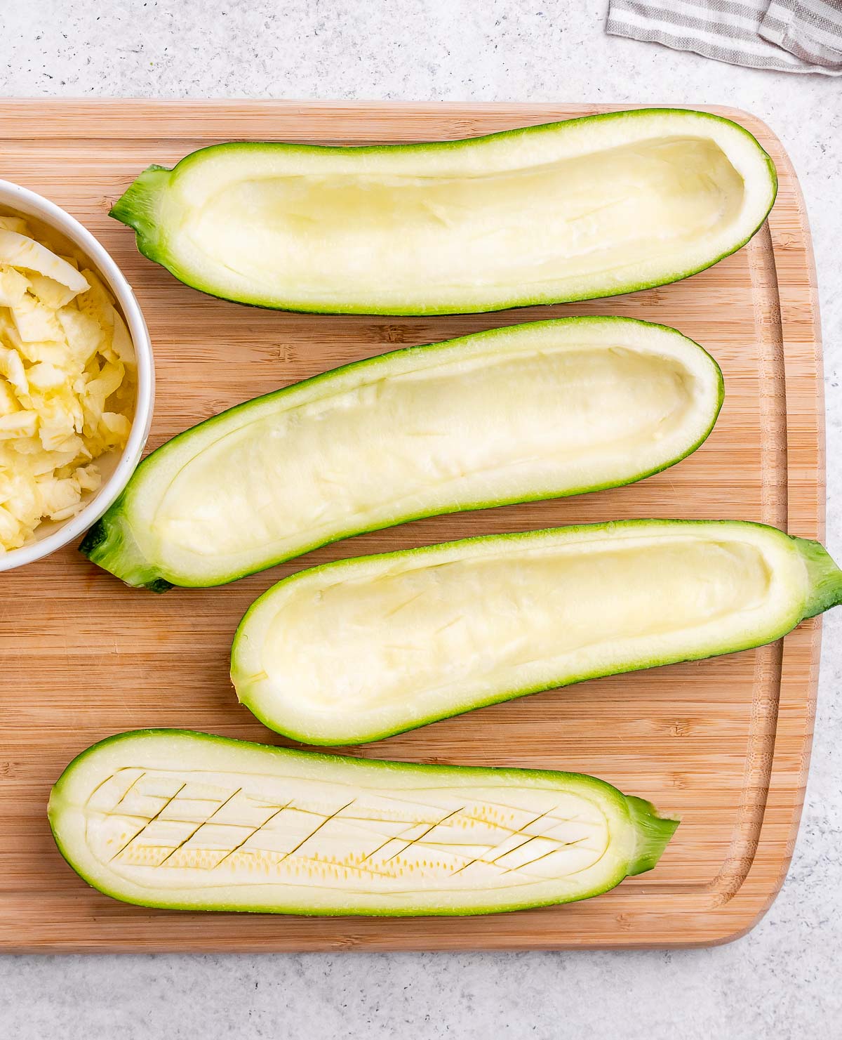 - Slice your zucchini in half lengthwise, and using a spoon, scoop out the inside creating boats as shown in the photos.