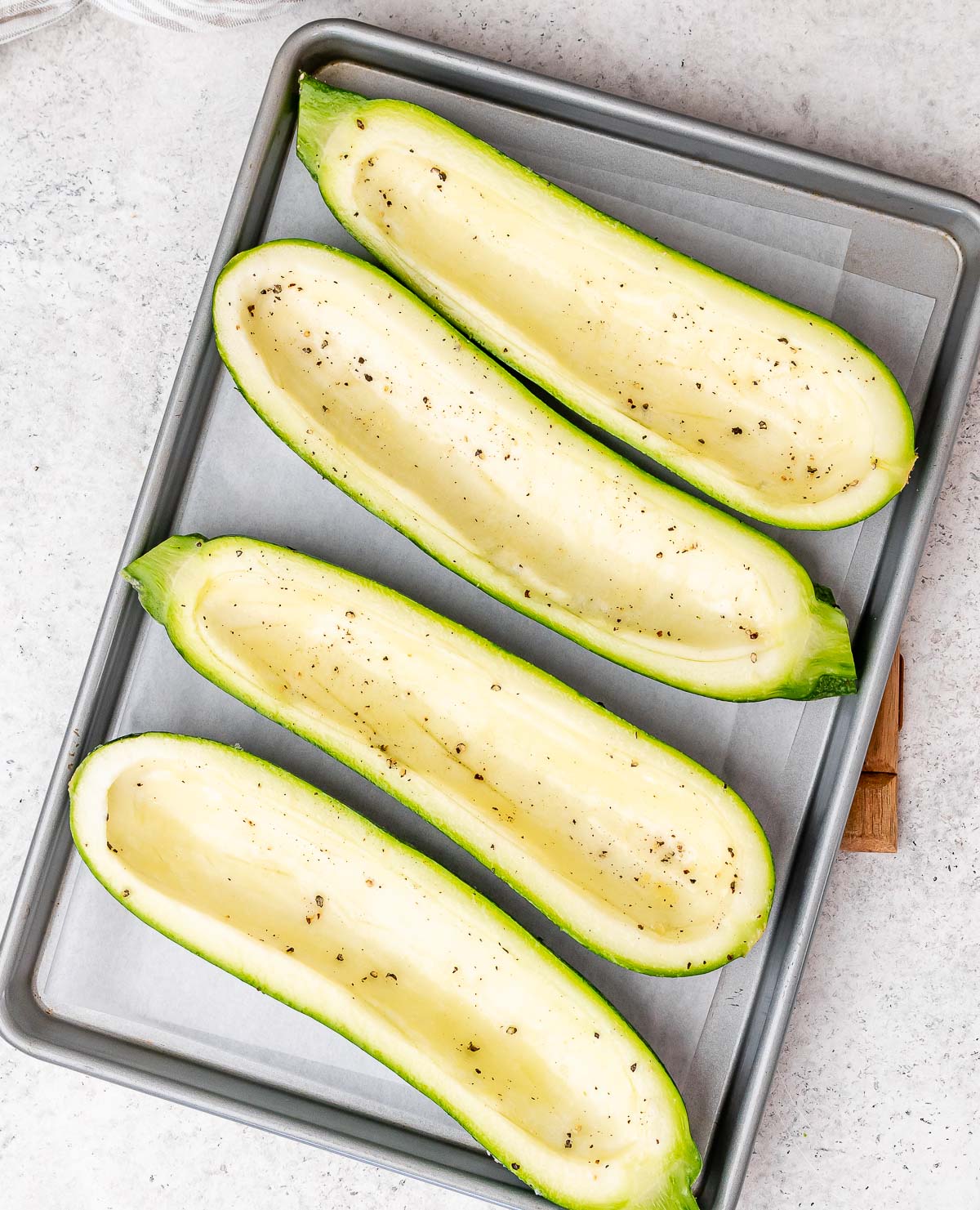 Place your prepared zucchini boats in a baking dish. Season lightly with sea salt and pepper. Roast for about 10 minutes.