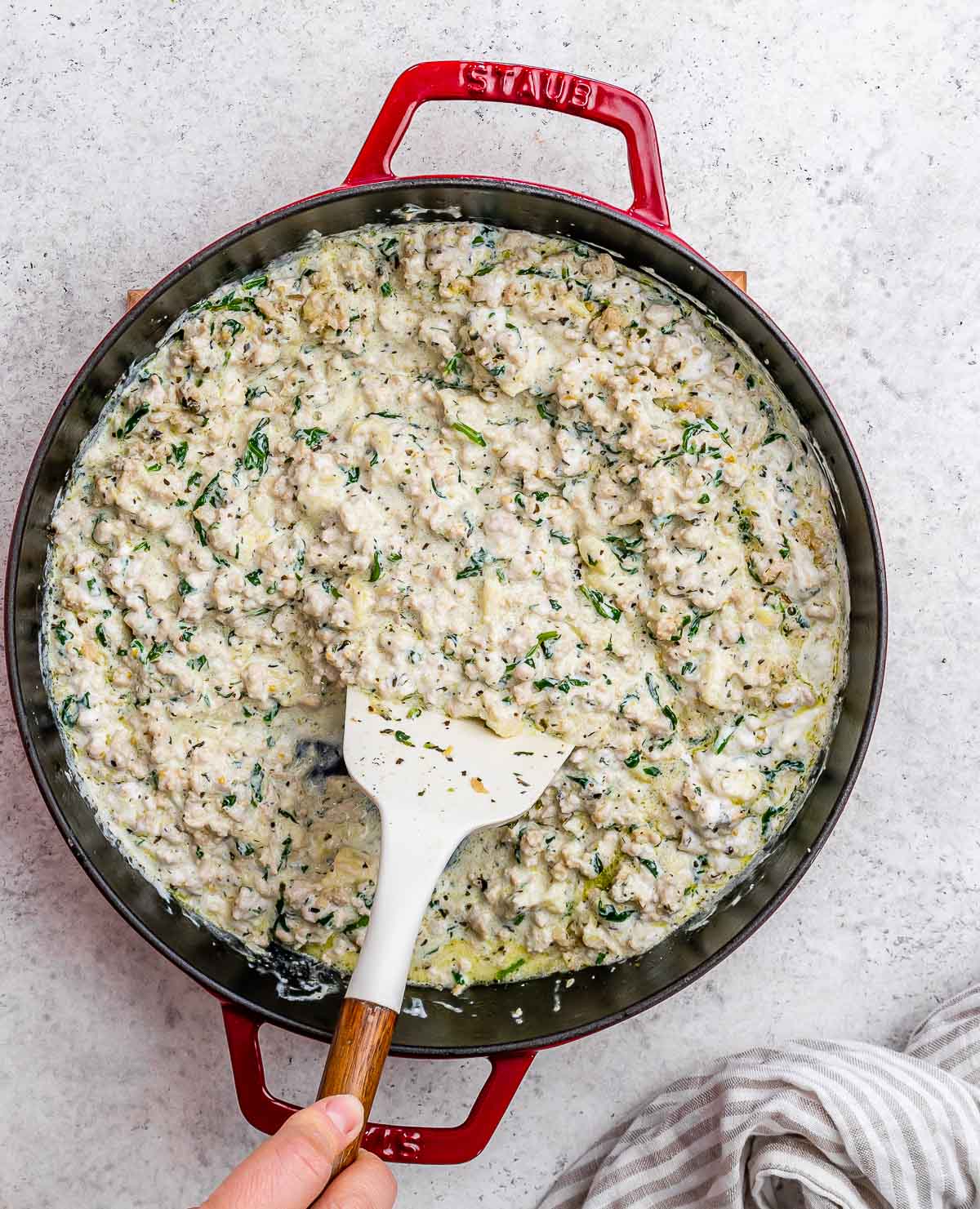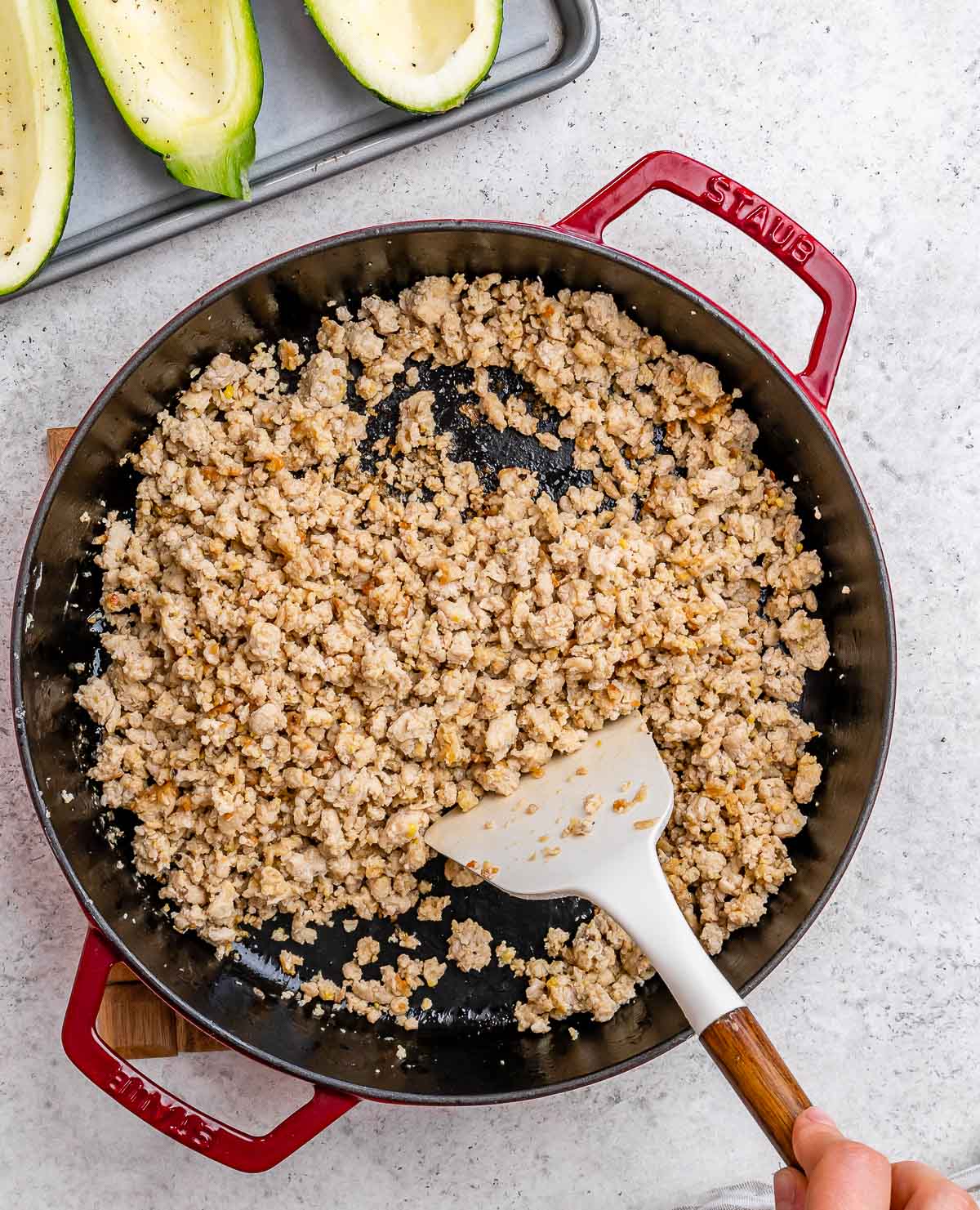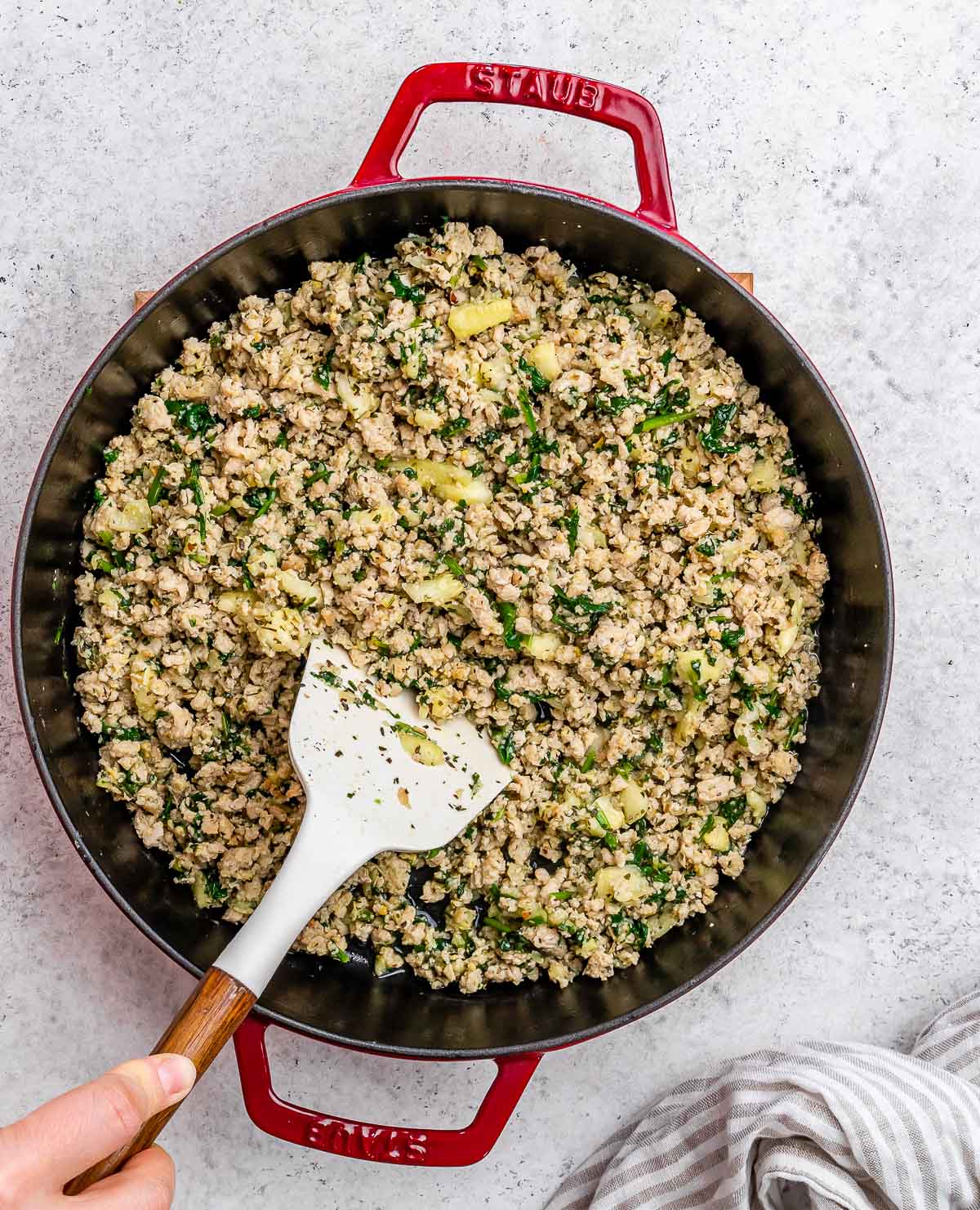 - Once the meat is no longer pink, add in the spinach, zucchini insides, garlic, Italian seasoning, sea salt and pepper.