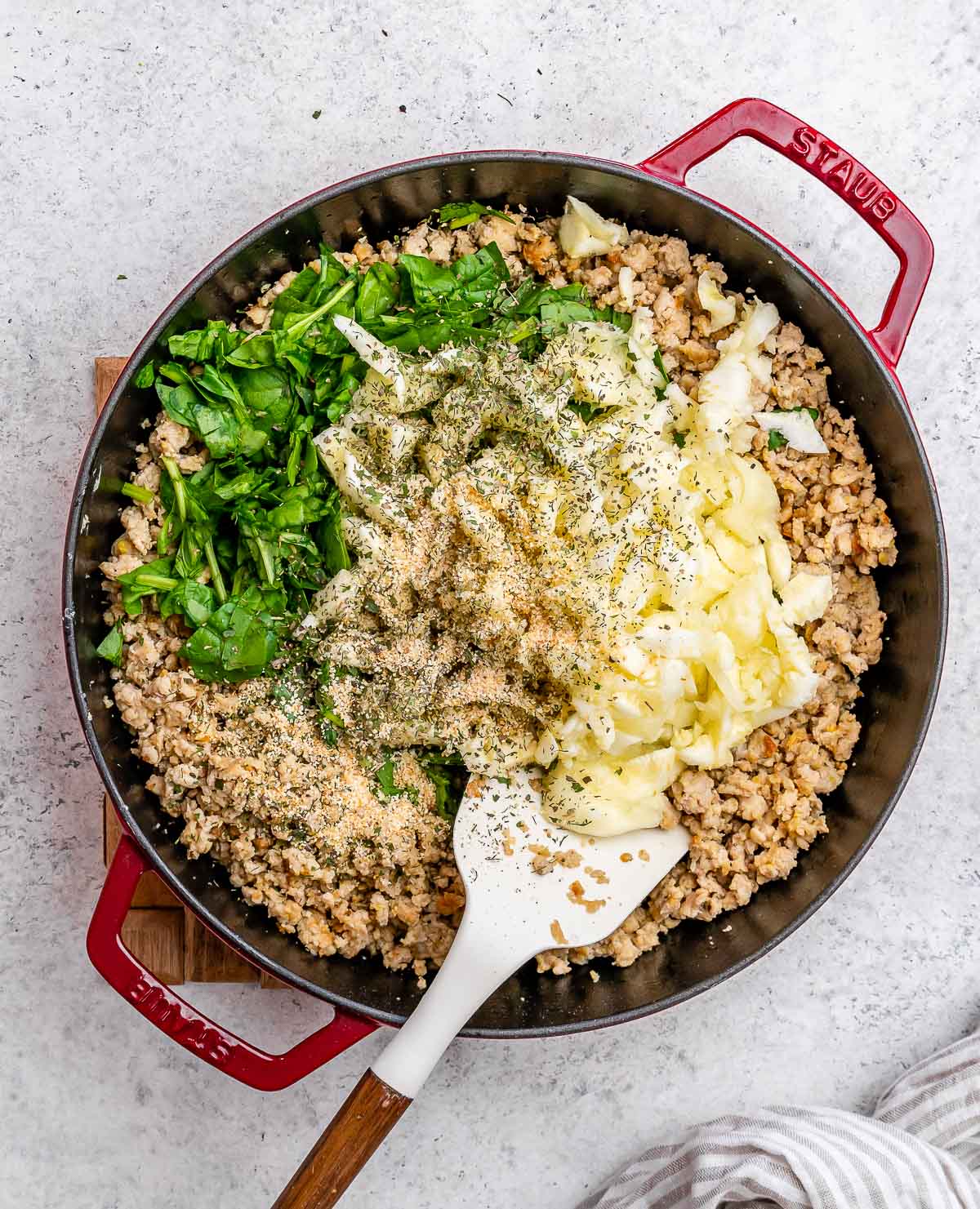 Once the meat is no longer pink, add in the spinach, zucchini insides, garlic, Italian seasoning, sea salt and pepper.