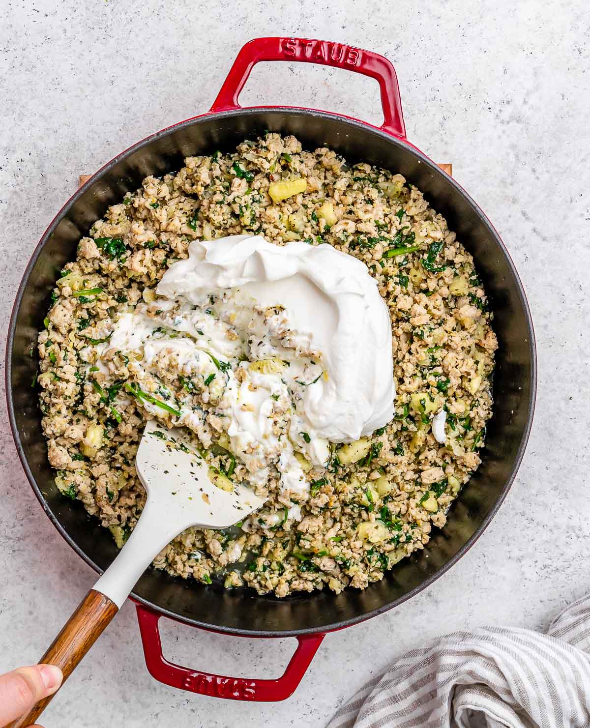- Remove the skillet from the heat then stir in your yogurt. Mix thoroughly to combine.