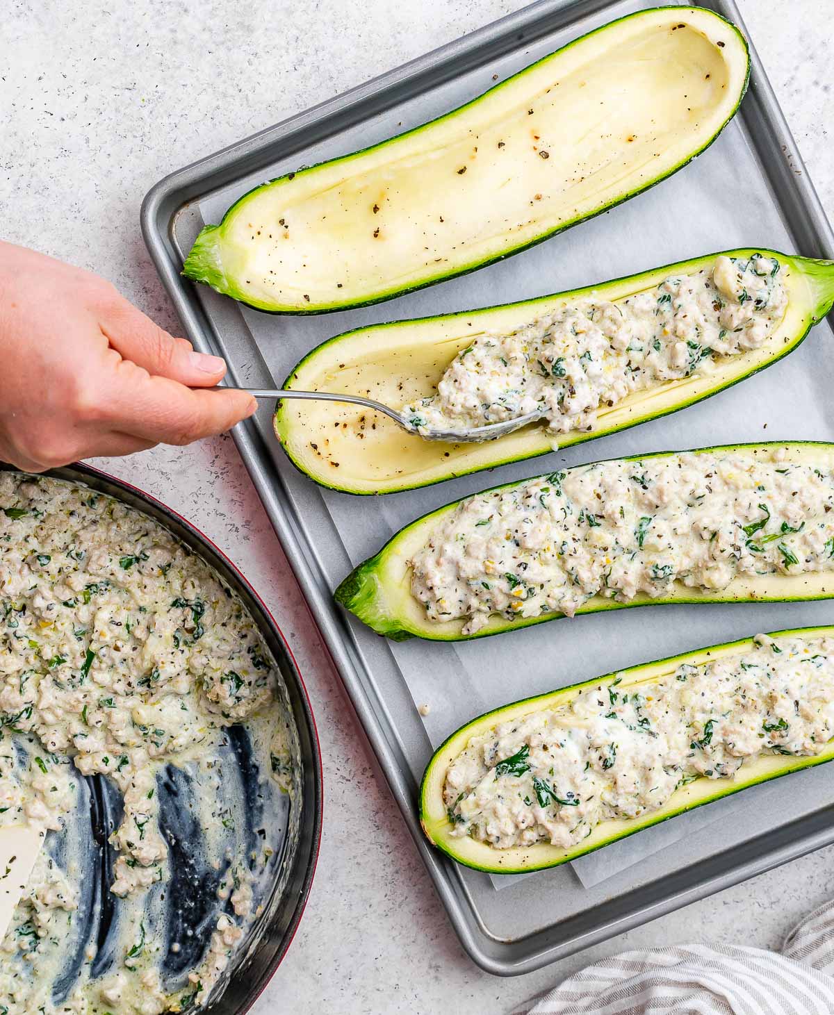 Slice your zucchini in half lengthwise, and using a spoon, scoop out the inside creating boats as shown in the photos.