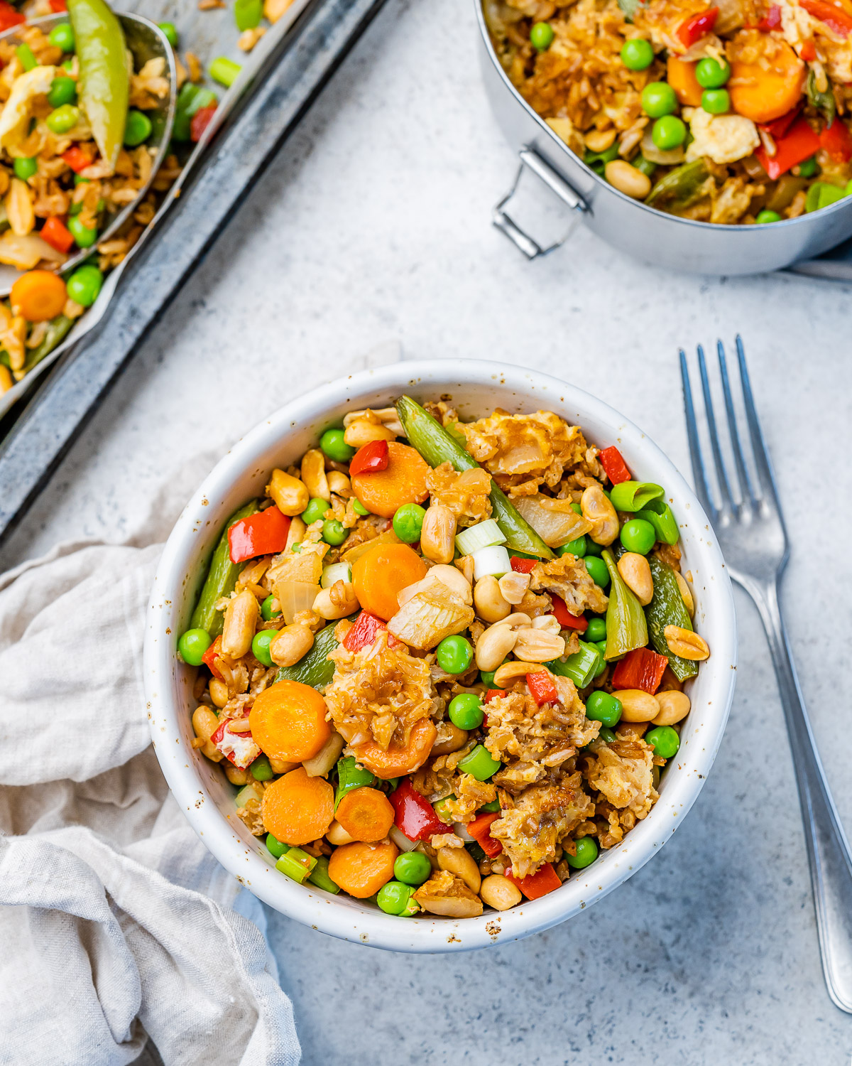 Add in the rice, carrots, sugar snap peas, bell pepper, and onions. Thoroughly stir to combine, then transfer evenly onto your prepared sheet pan.