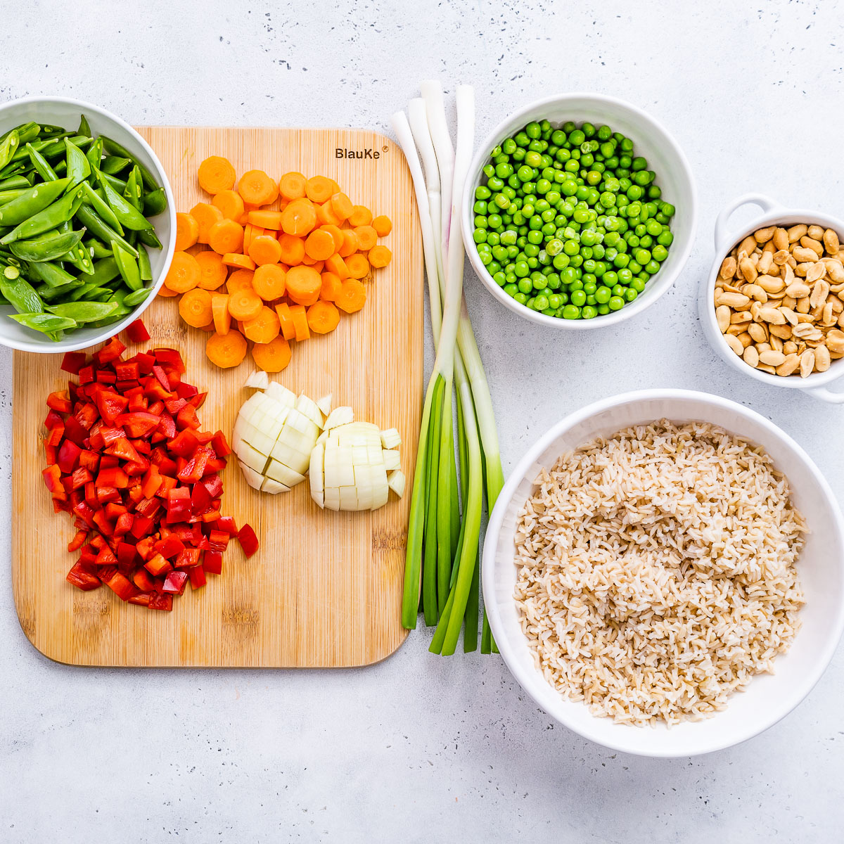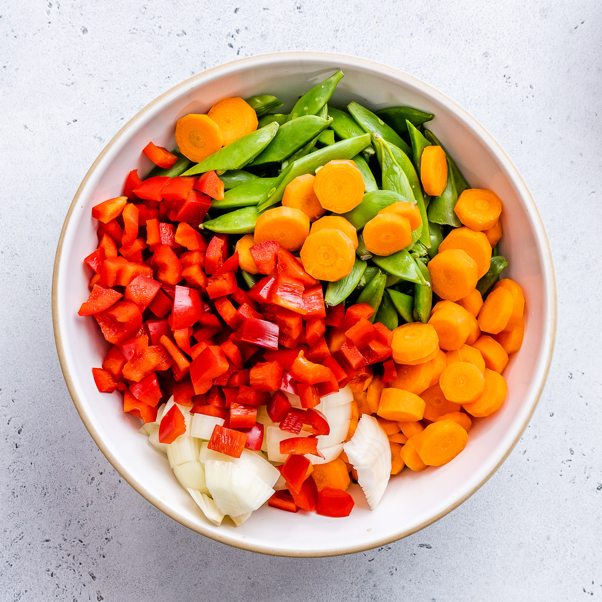 - Add in the rice, carrots, sugar snap peas, bell pepper, and onions.