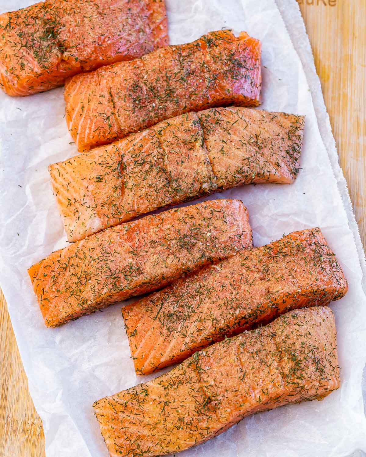 Pat your salmon filets dry on all sides. Rub your salmon with garlic salt and dried dill on all sides.