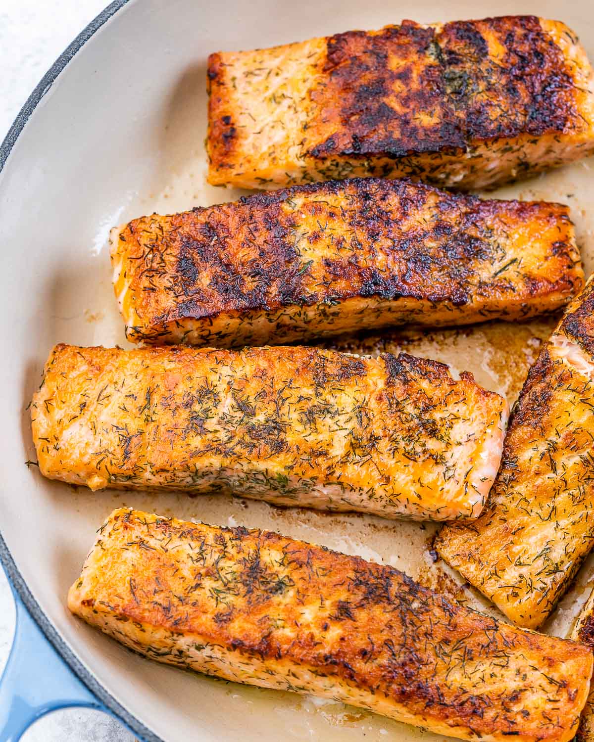 - Preheat your oil in a large skillet over medium heat. Sear the salmon until nicely golden on both sides.