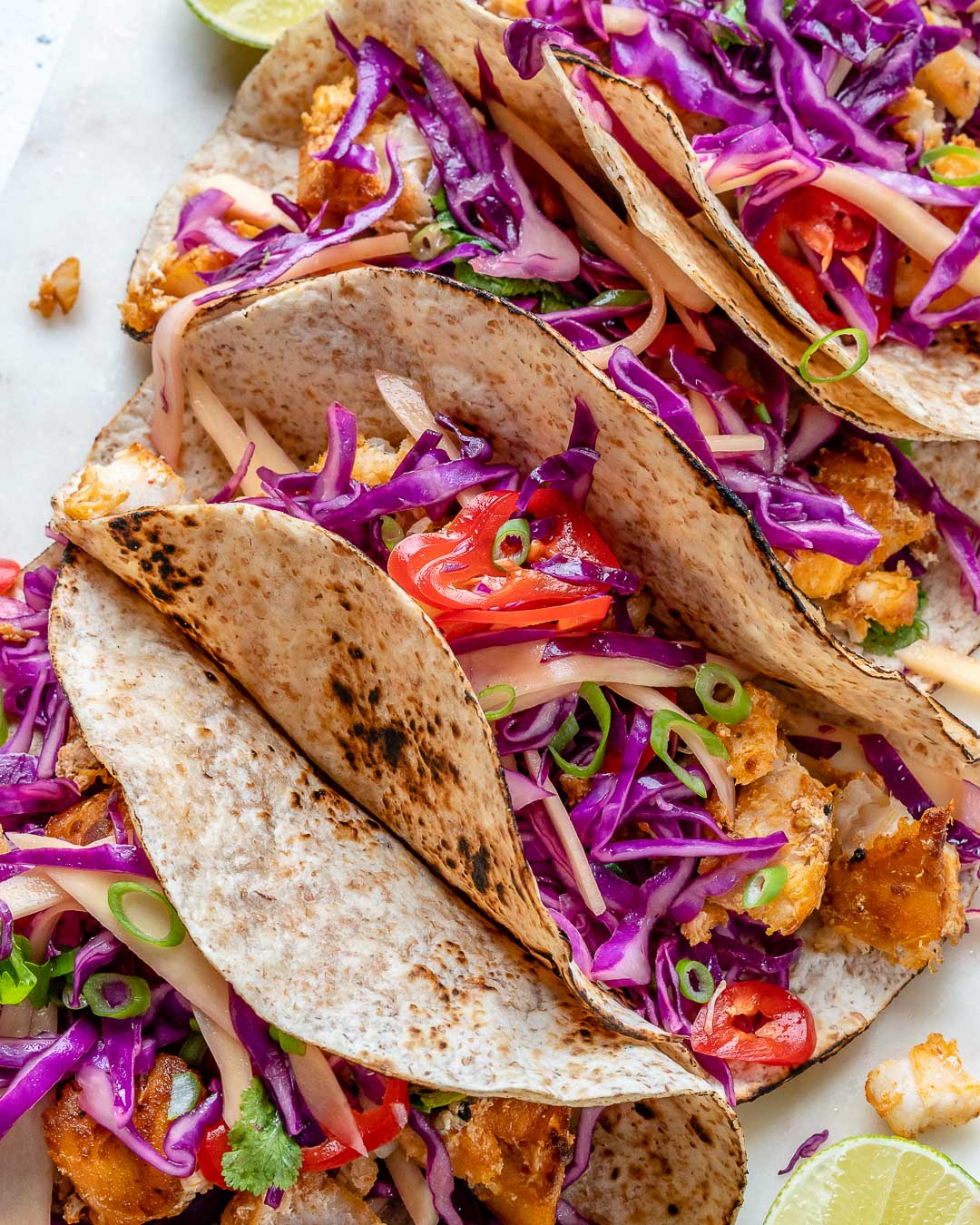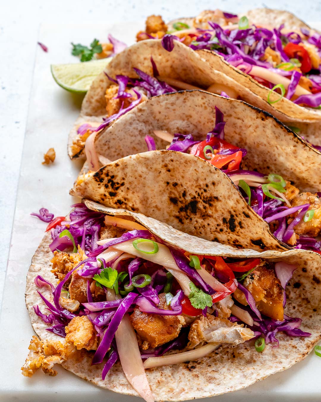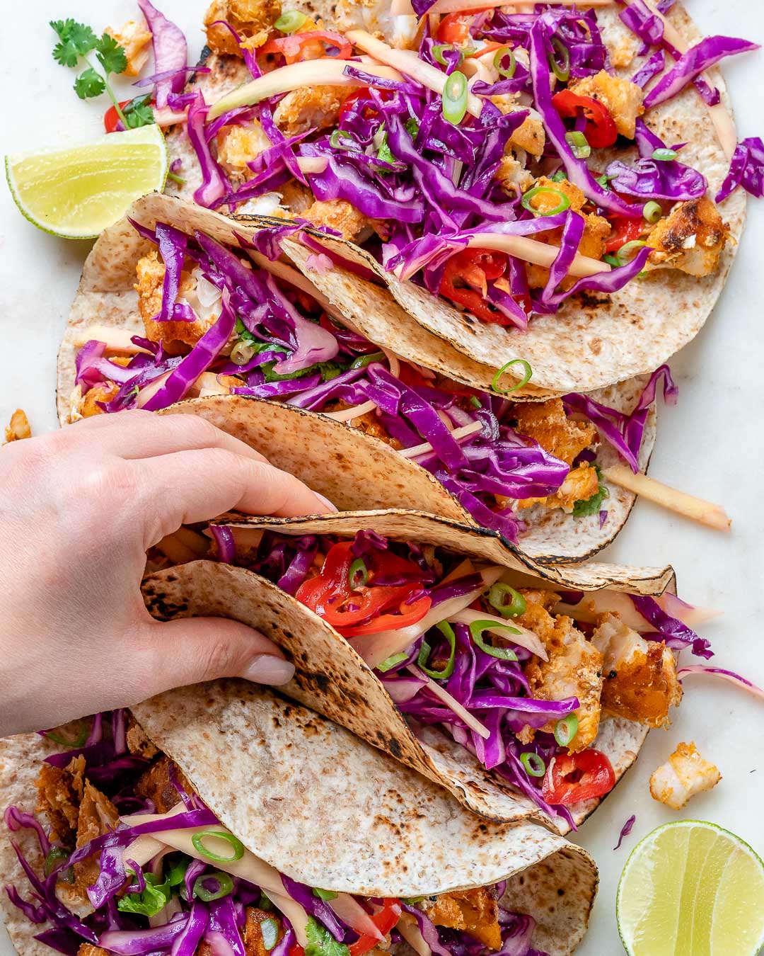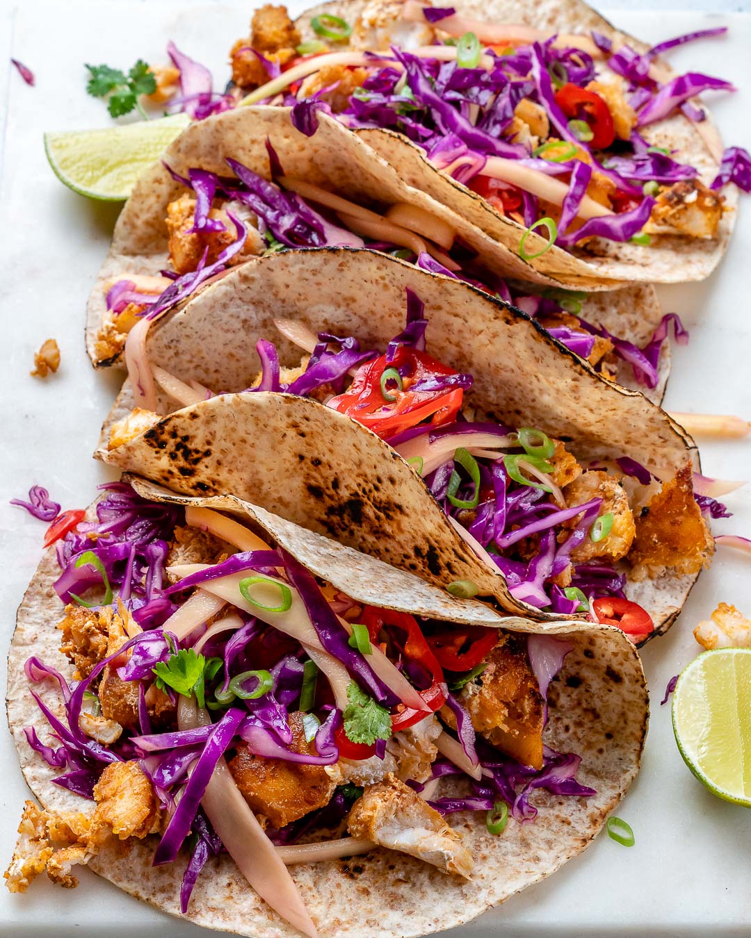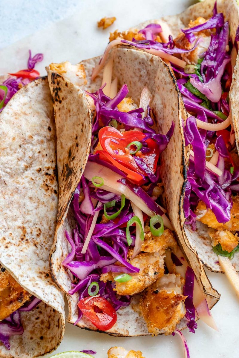 - Load up your warm tortillas with fish and top with your delicious mango-cabbage mixture.