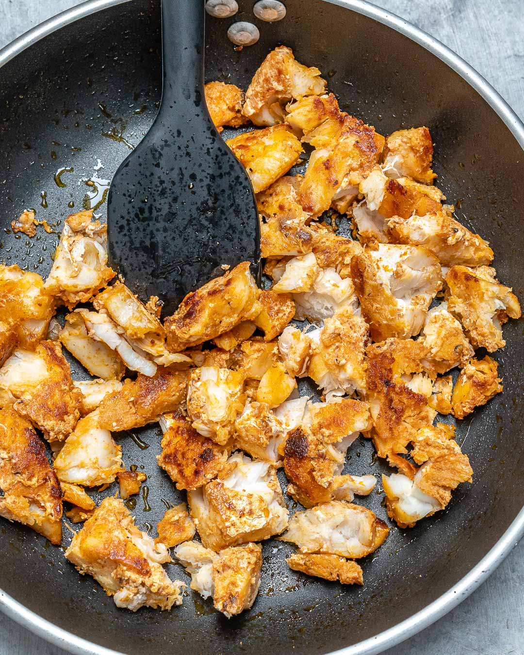 - Cut your fish into 1/2" inch cubes, then pat off the excess moisture really well with paper towels; place cubes in a bowl and sprinkle with chipotle powder, cumin, sea salt and pepper to taste. Drizzle with 1 Tablespoon of oil and gently toss to coat.