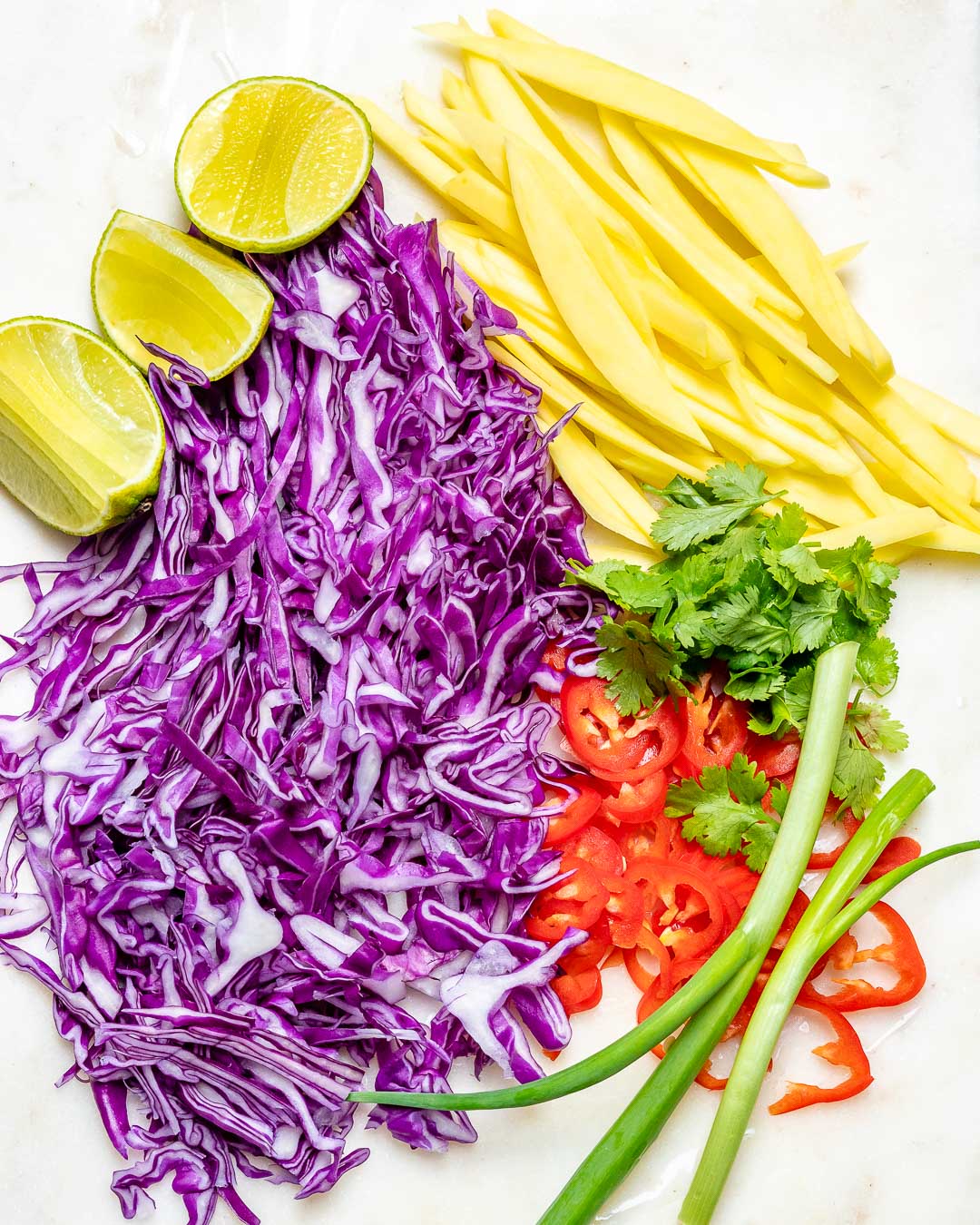 Combine your sliced and chopped cabbage, mango, chili, scallions, cilantro, and lime juice in a bowl. Season with sea salt and pepper to your liking and toss well to coat.