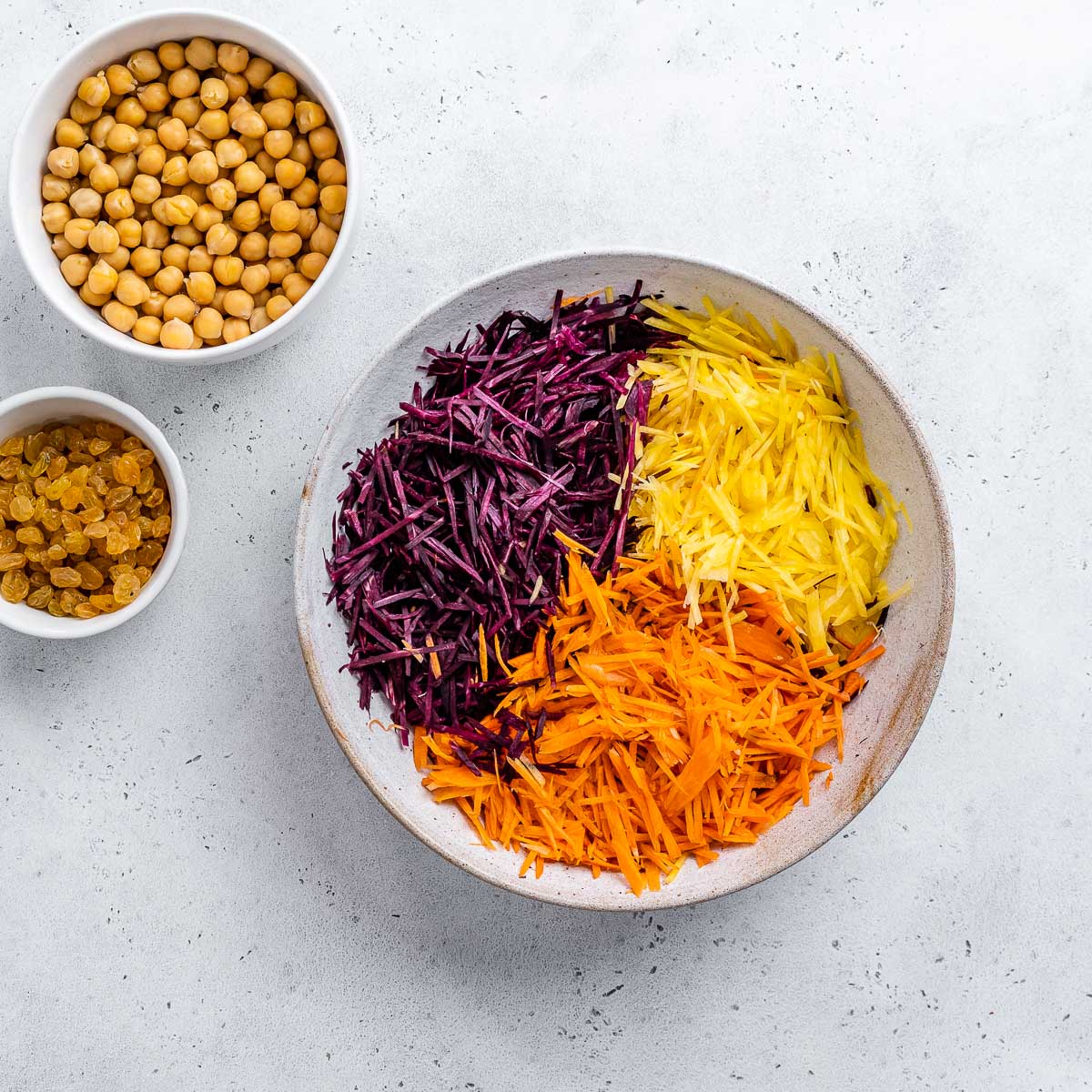- Place the raisins, lemon zest, lemon juice and chickpeas in a large bowl and stir to combine.