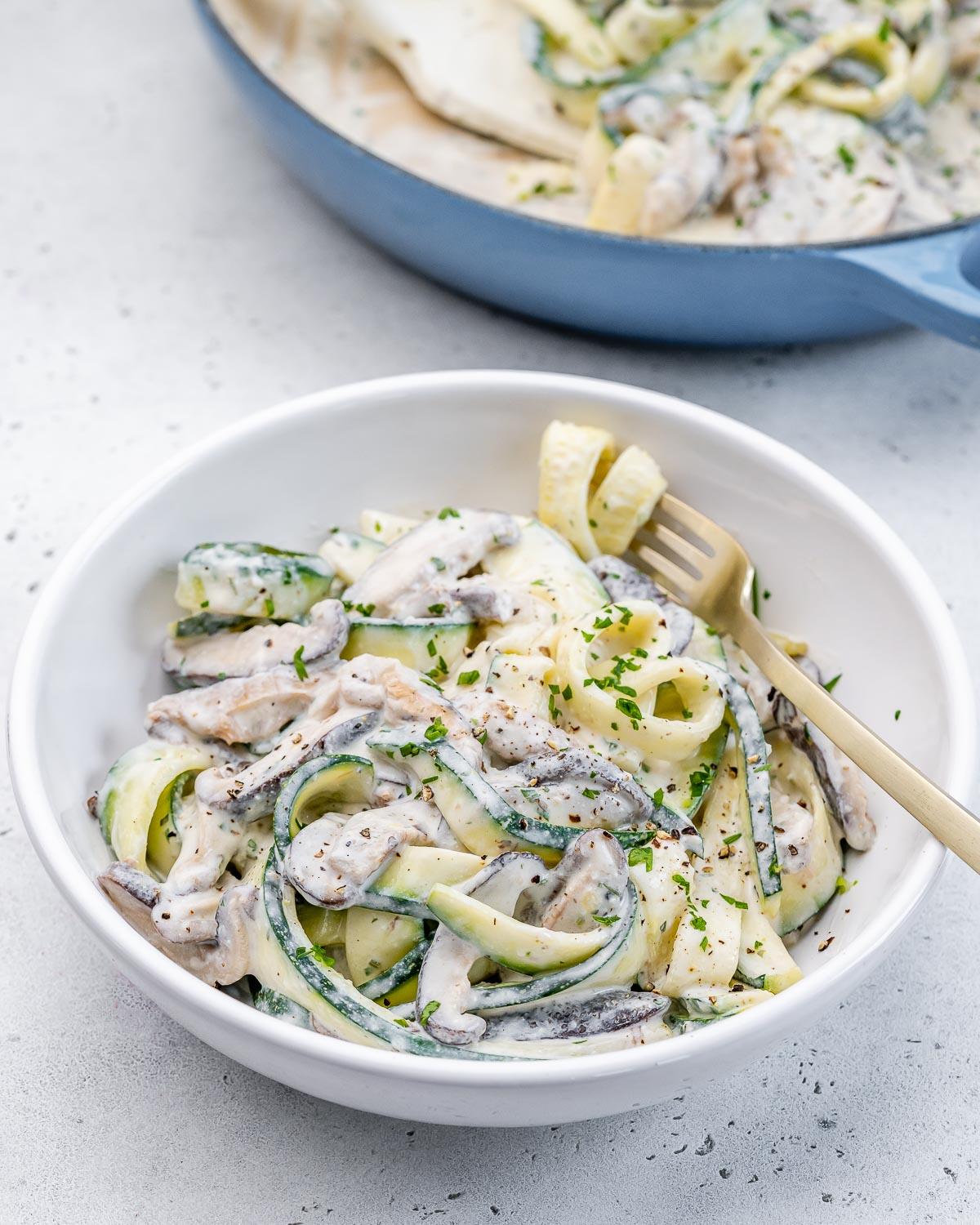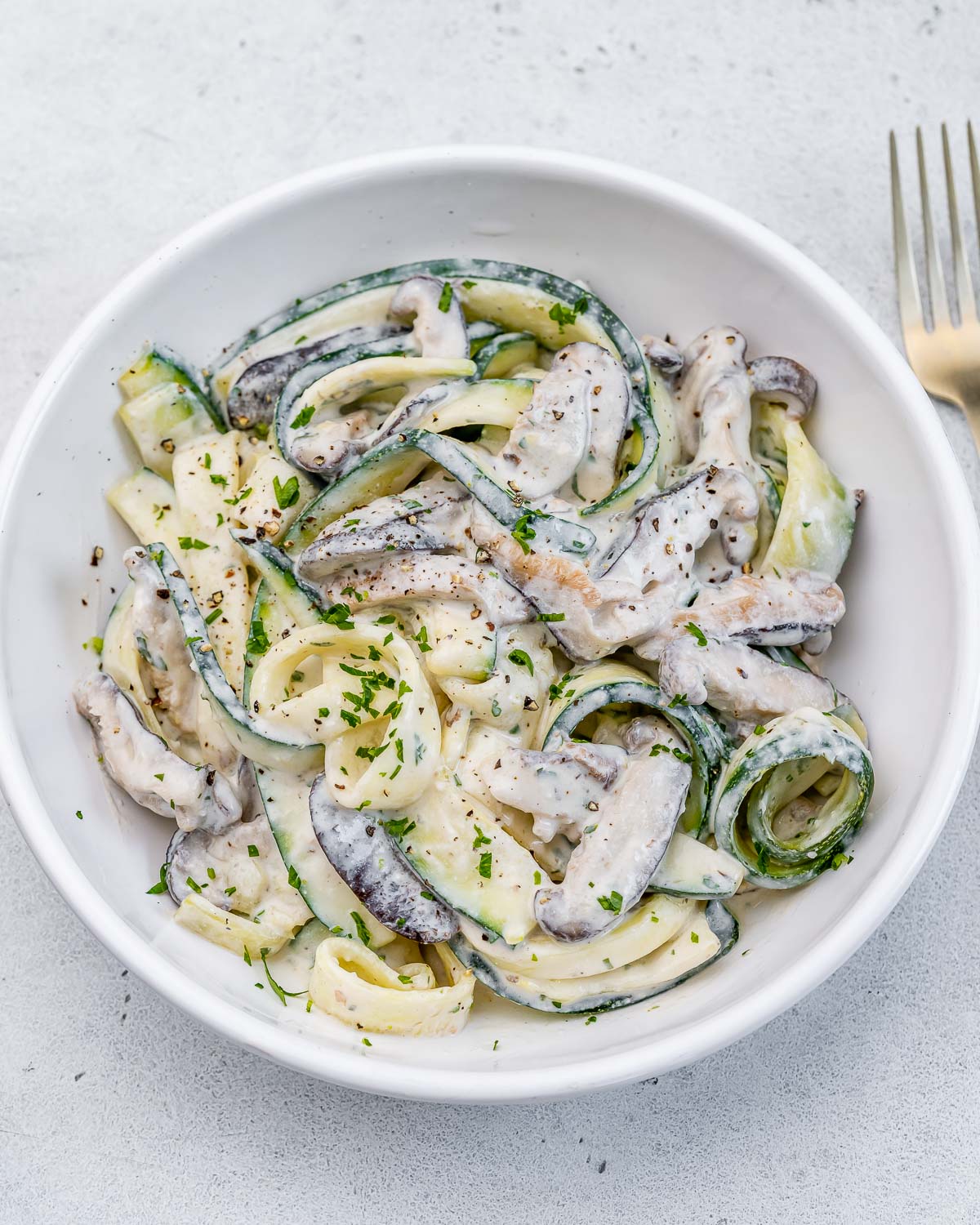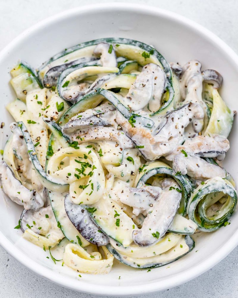 Indulgent, Creamy Zucchini Noodles Alfredo, ready in just a few minutes! Loads of flavor thanks to the fresh mushrooms and garlic!