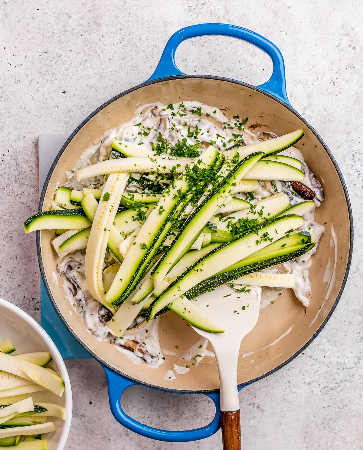 Lightly blot your zucchini noodles with a paper towel to remove excess moisture. Add your prepared zucchini noodles into your sauce and stir to combine.