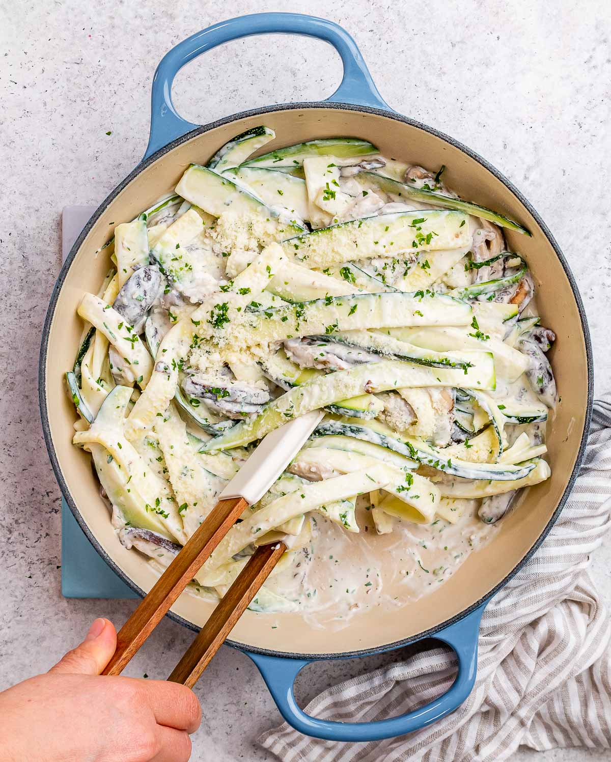 - Lightly blot your zucchini noodles with a paper towel to remove excess moisture.